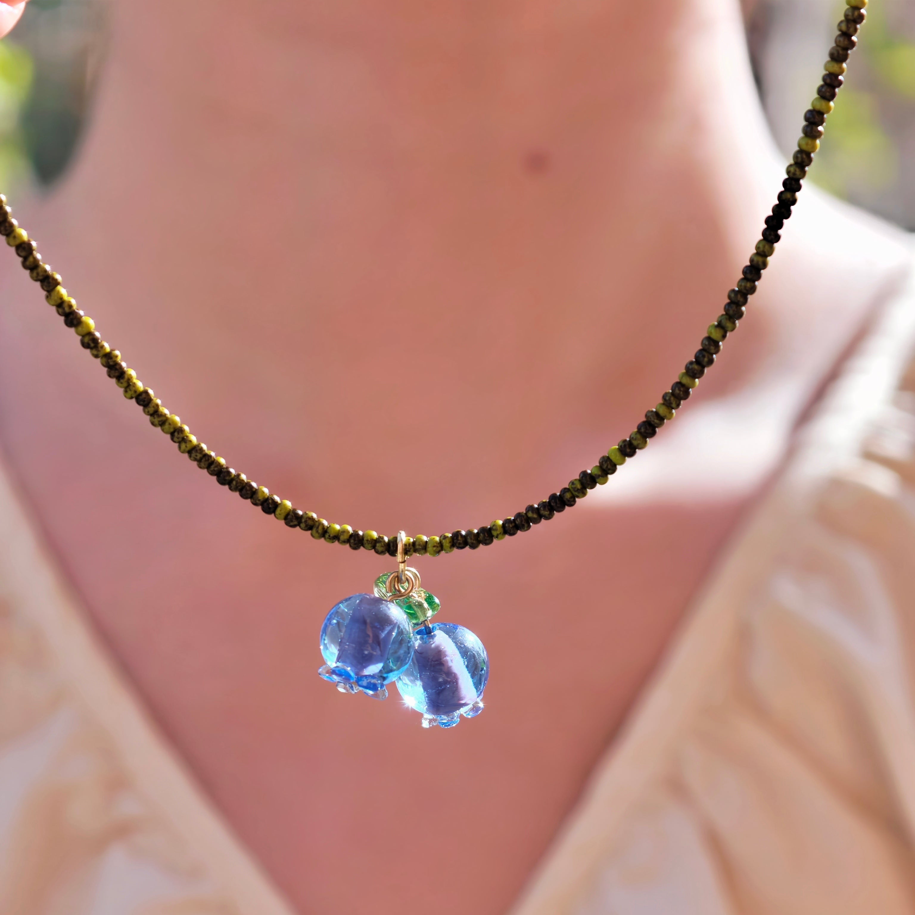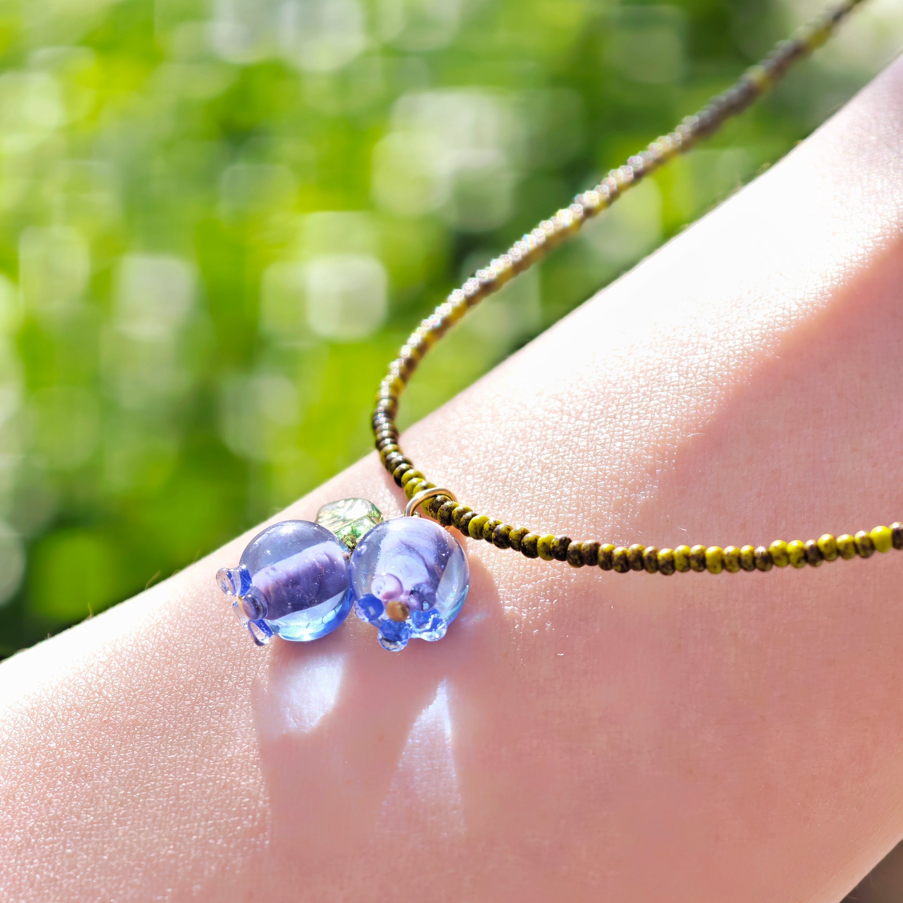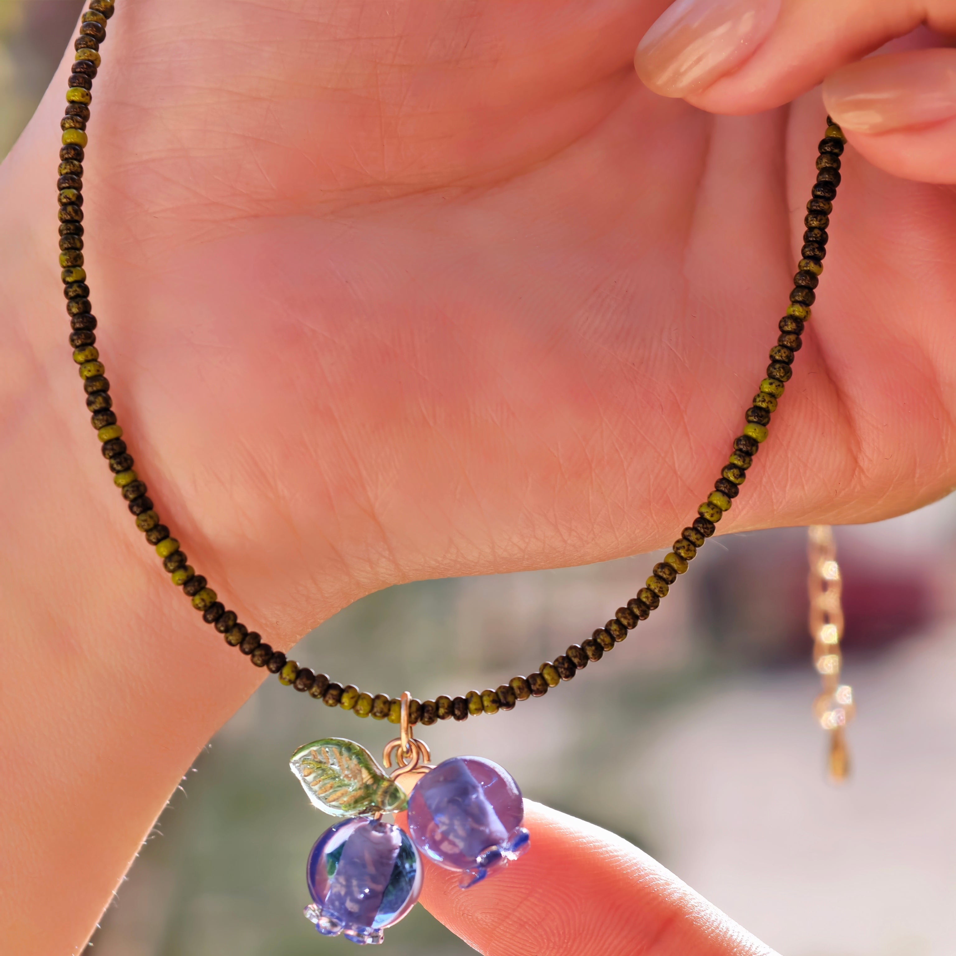 The Blueberry Kiss Necklace features two plump glass blueberries nestled beneath a golden leaf — as if freshly picked from a sun-dappled branch.