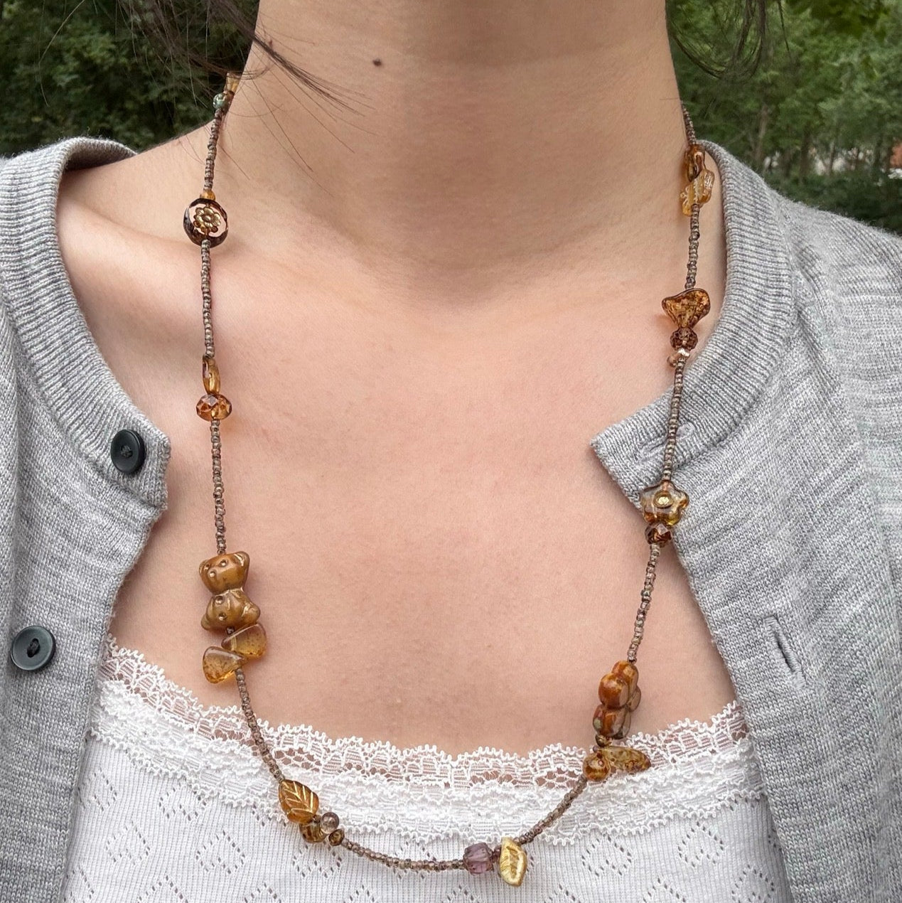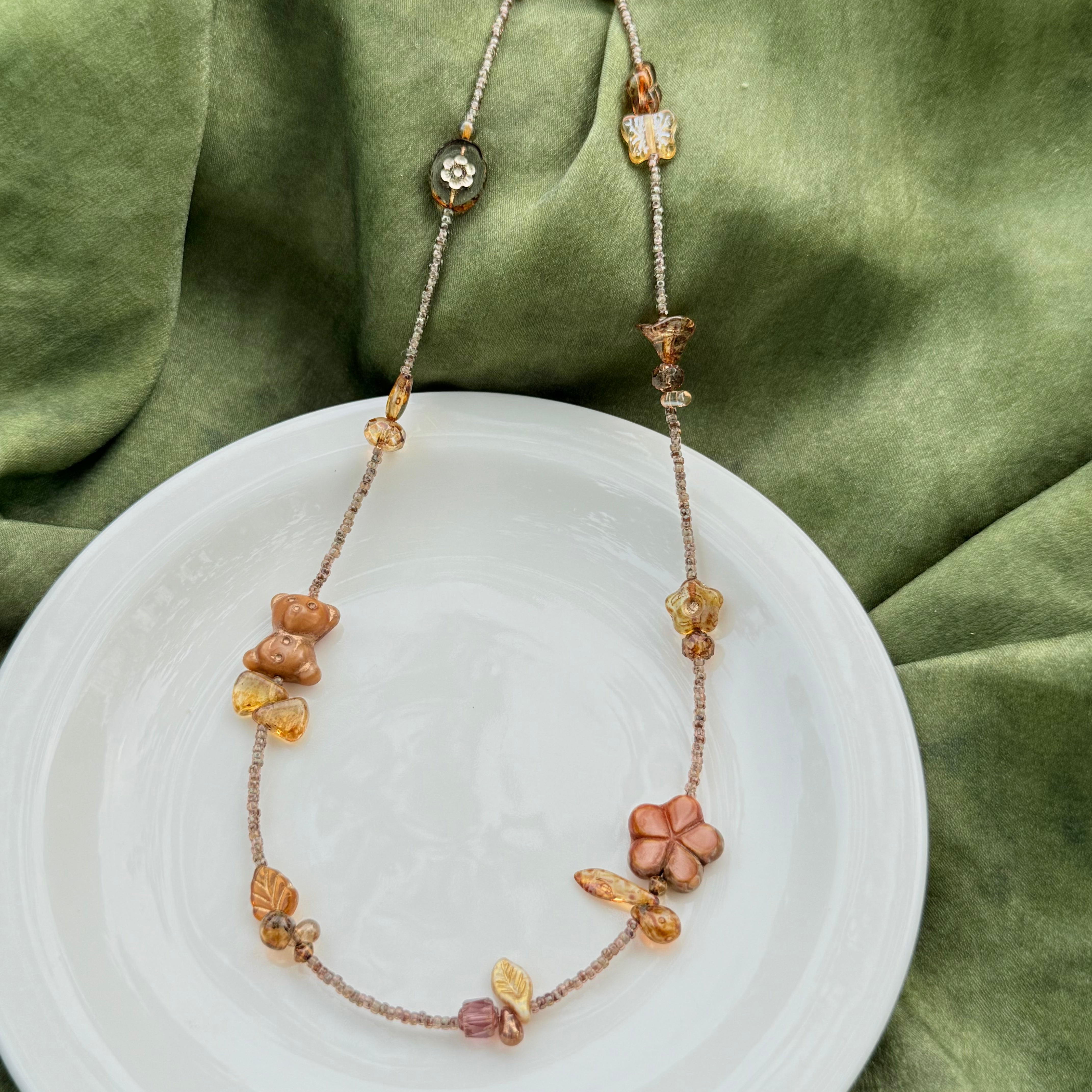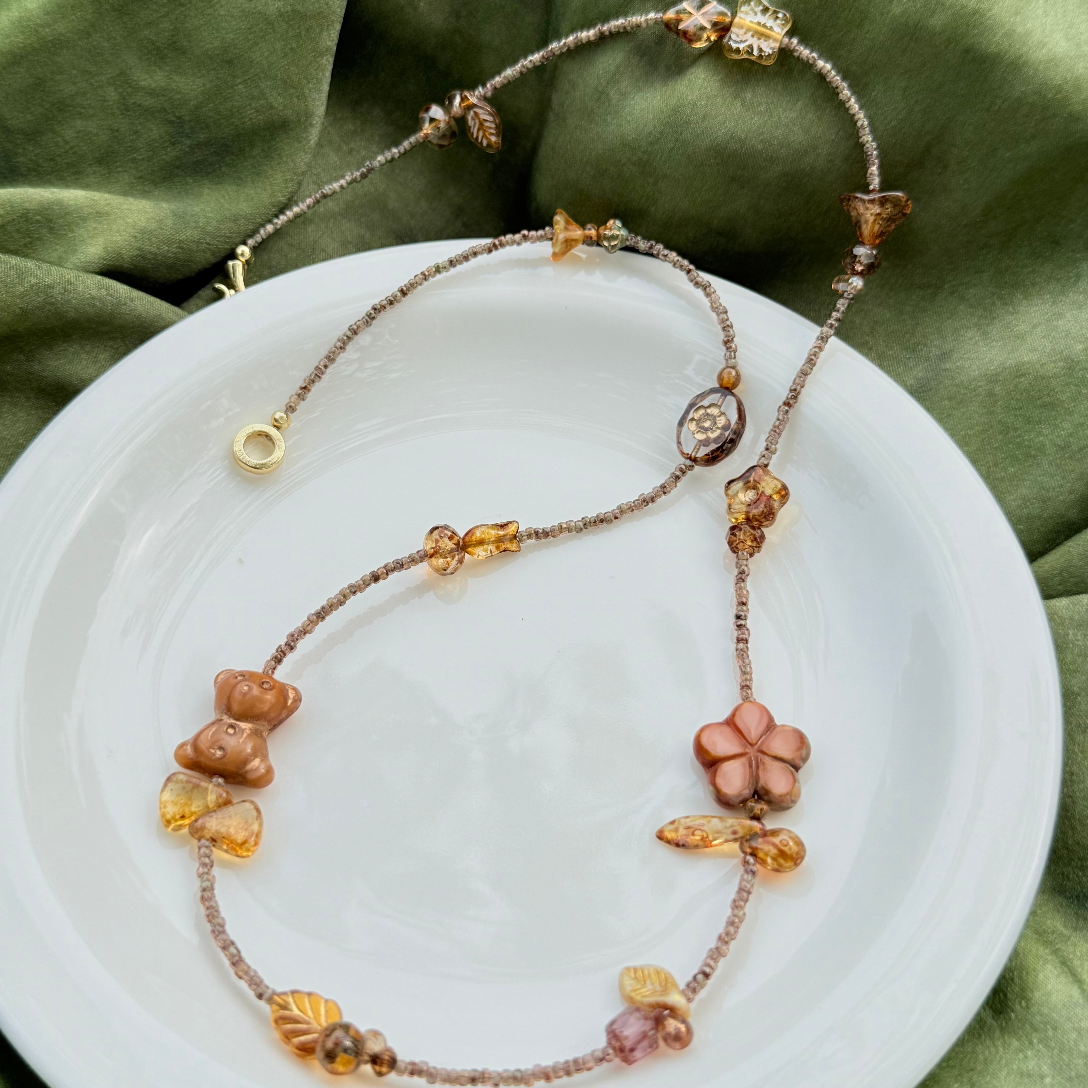 With its earthy golden tones and playful teddy bear charm, the Amberwood Bloom necklace invites you into a woodland daydream. Handmade with warm Czech and antique glass beads, each element carries a hint of nostalgia and natural charm.