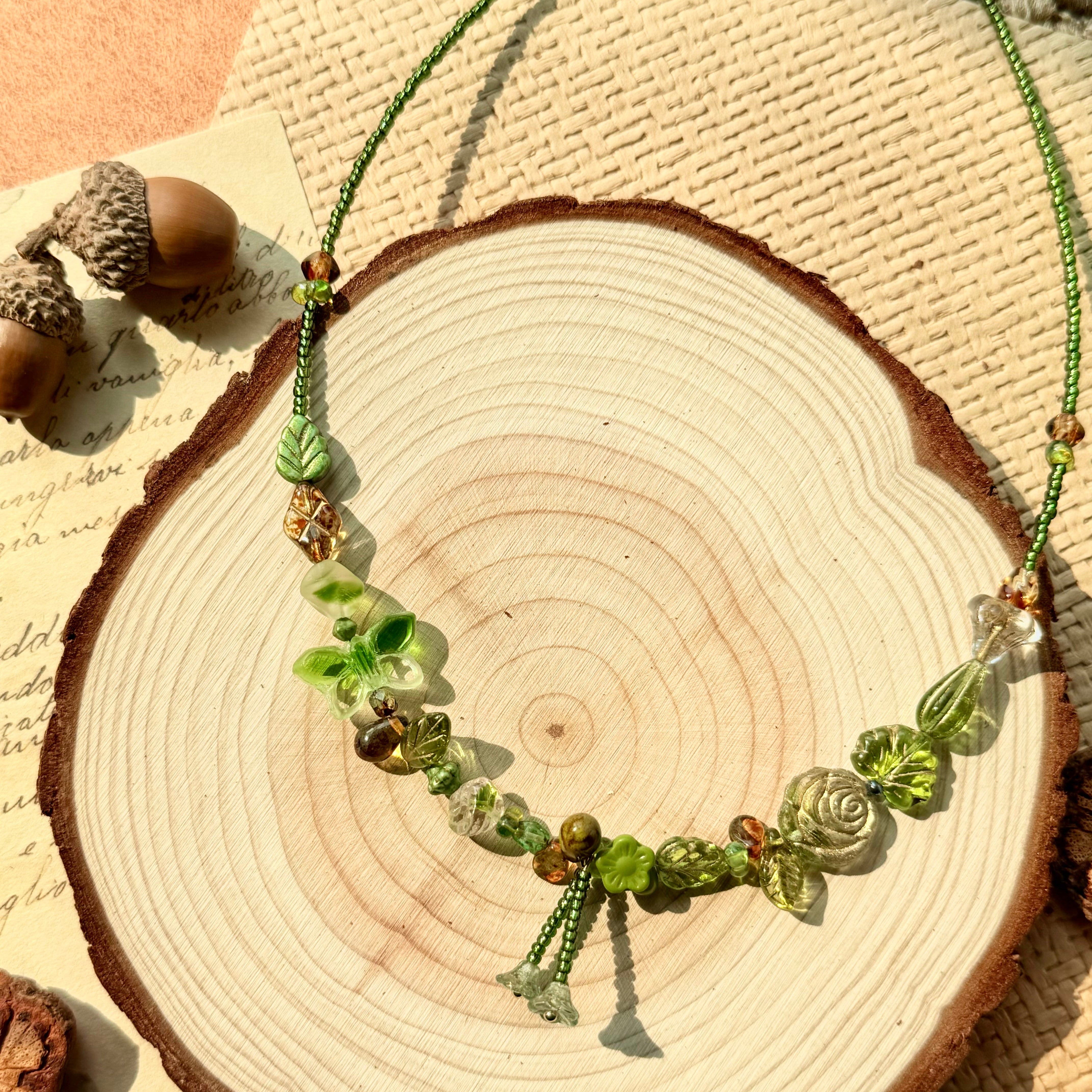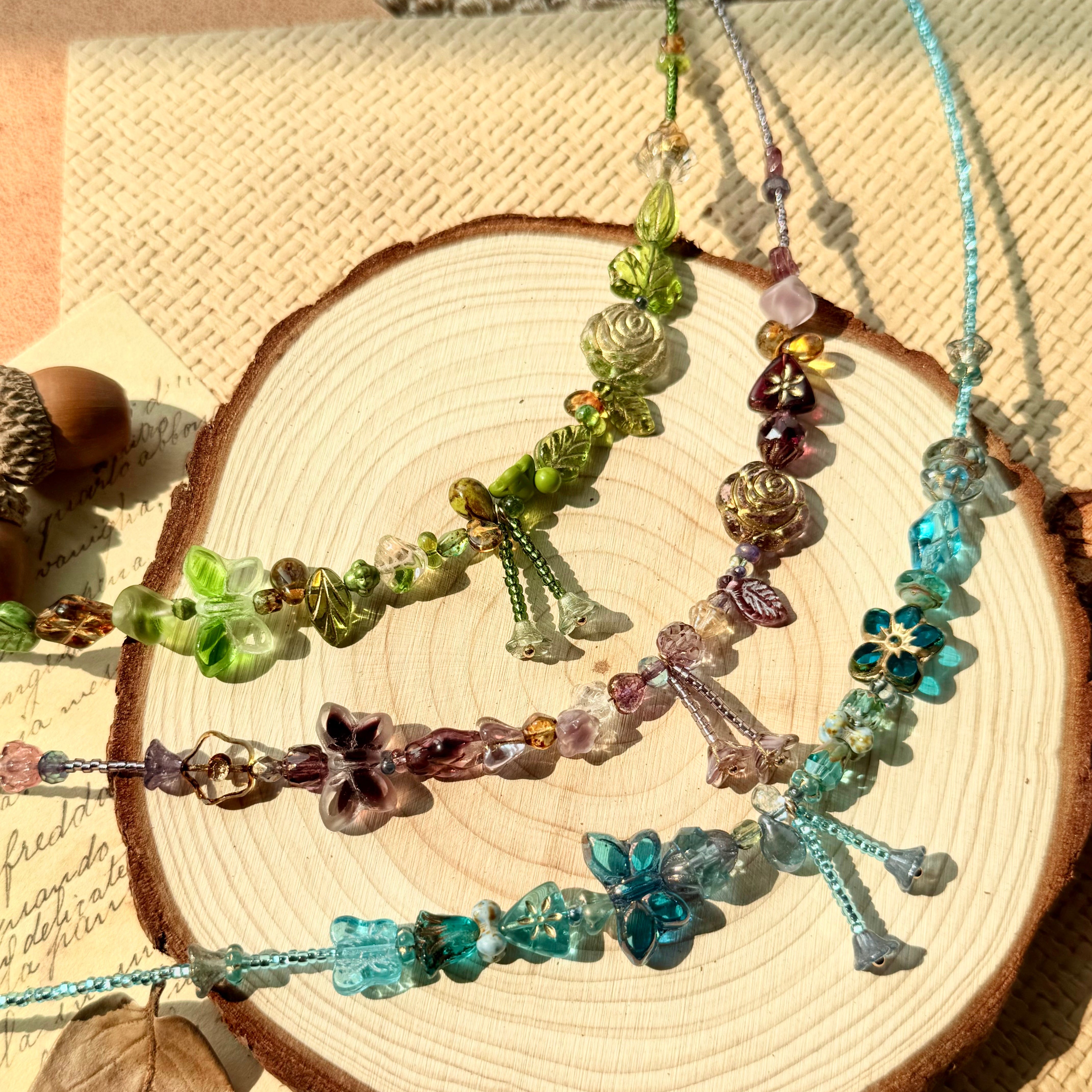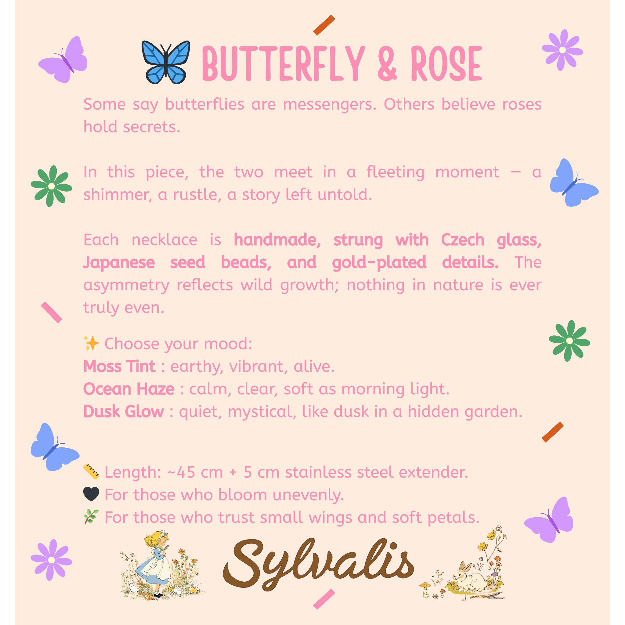 The Butterfly & Rose Necklace is a nature-inspired, asymmetrical design made with Czech glass, Japanese seed beads, and gold-plated accents. It celebrates wild beauty — the kind that grows uneven, soft, and free.