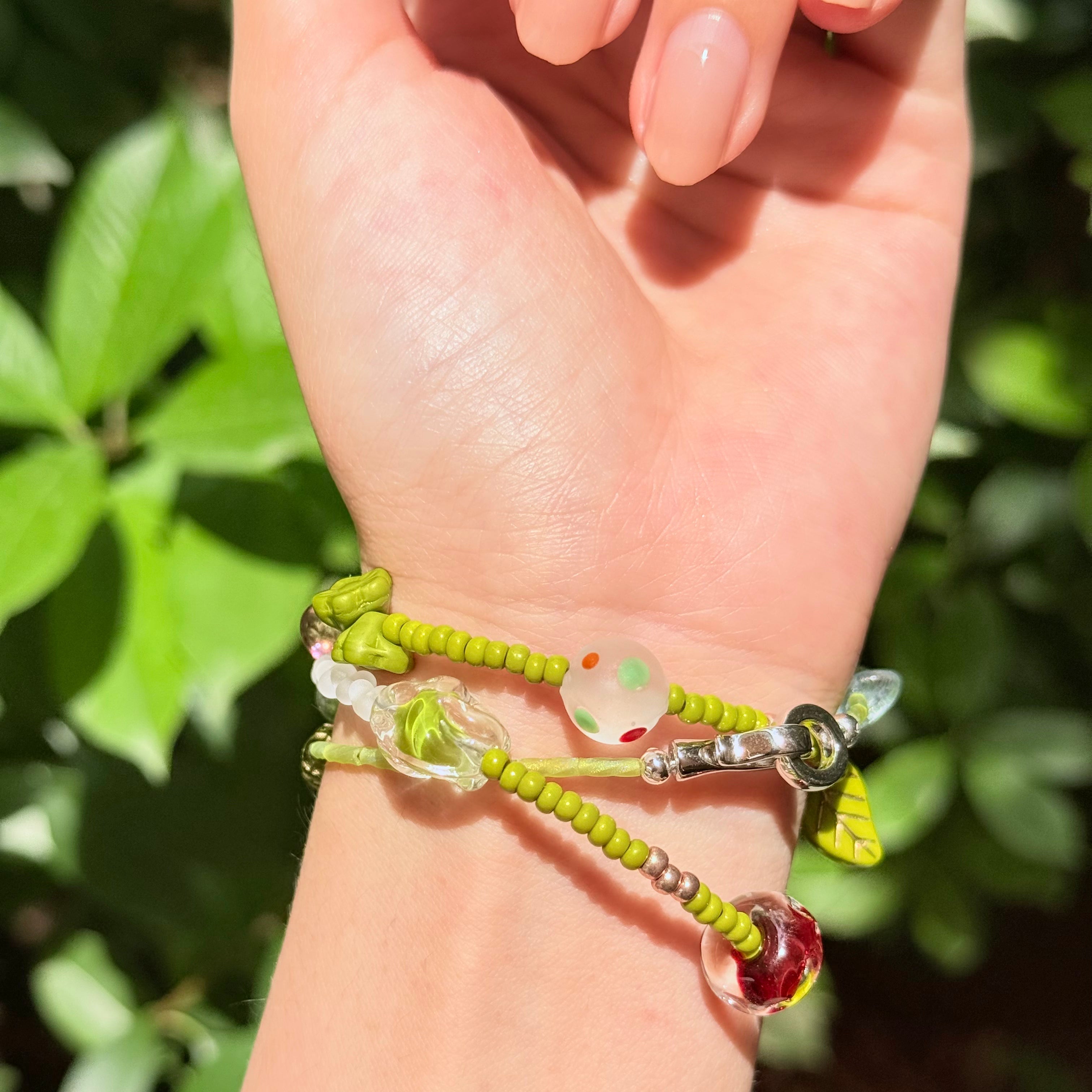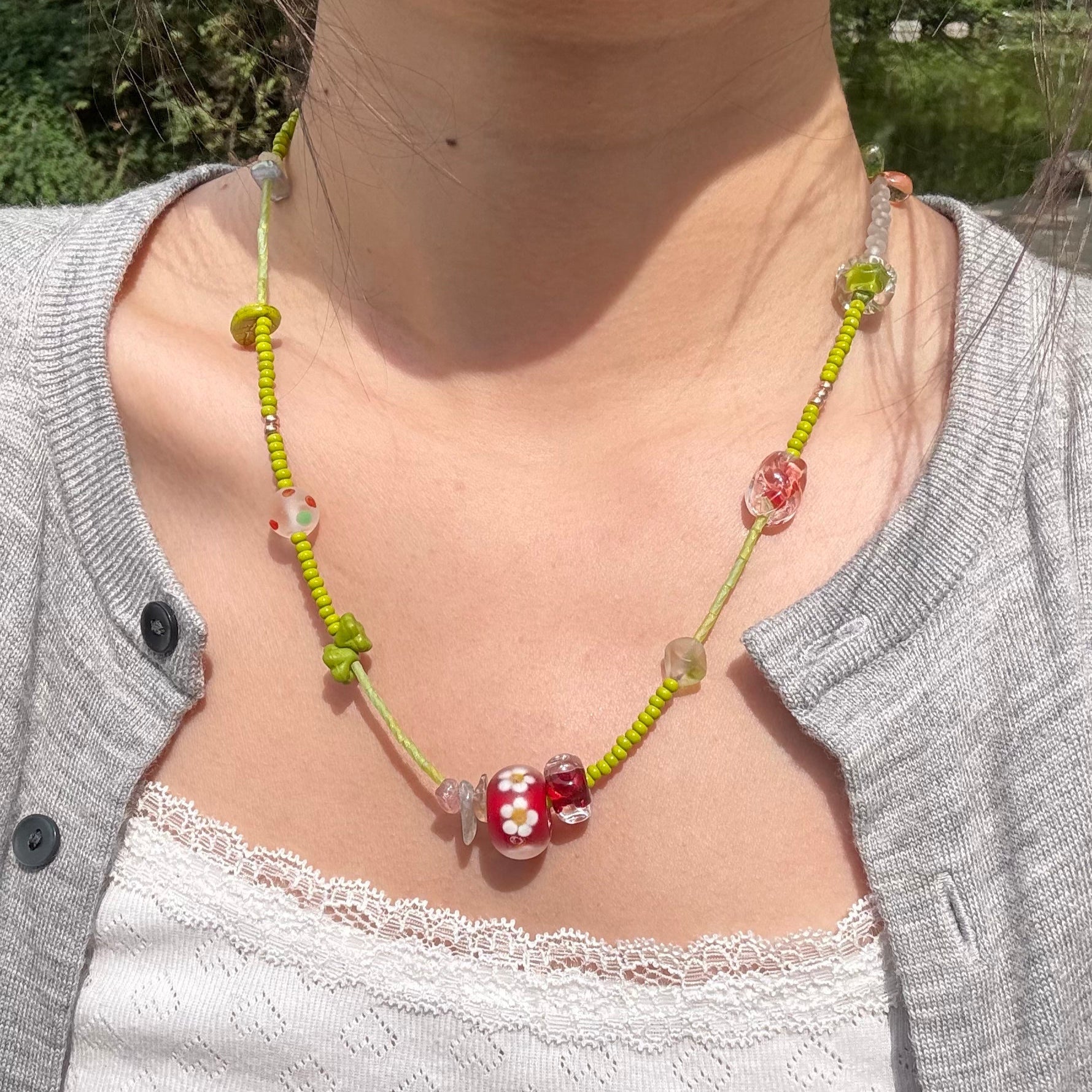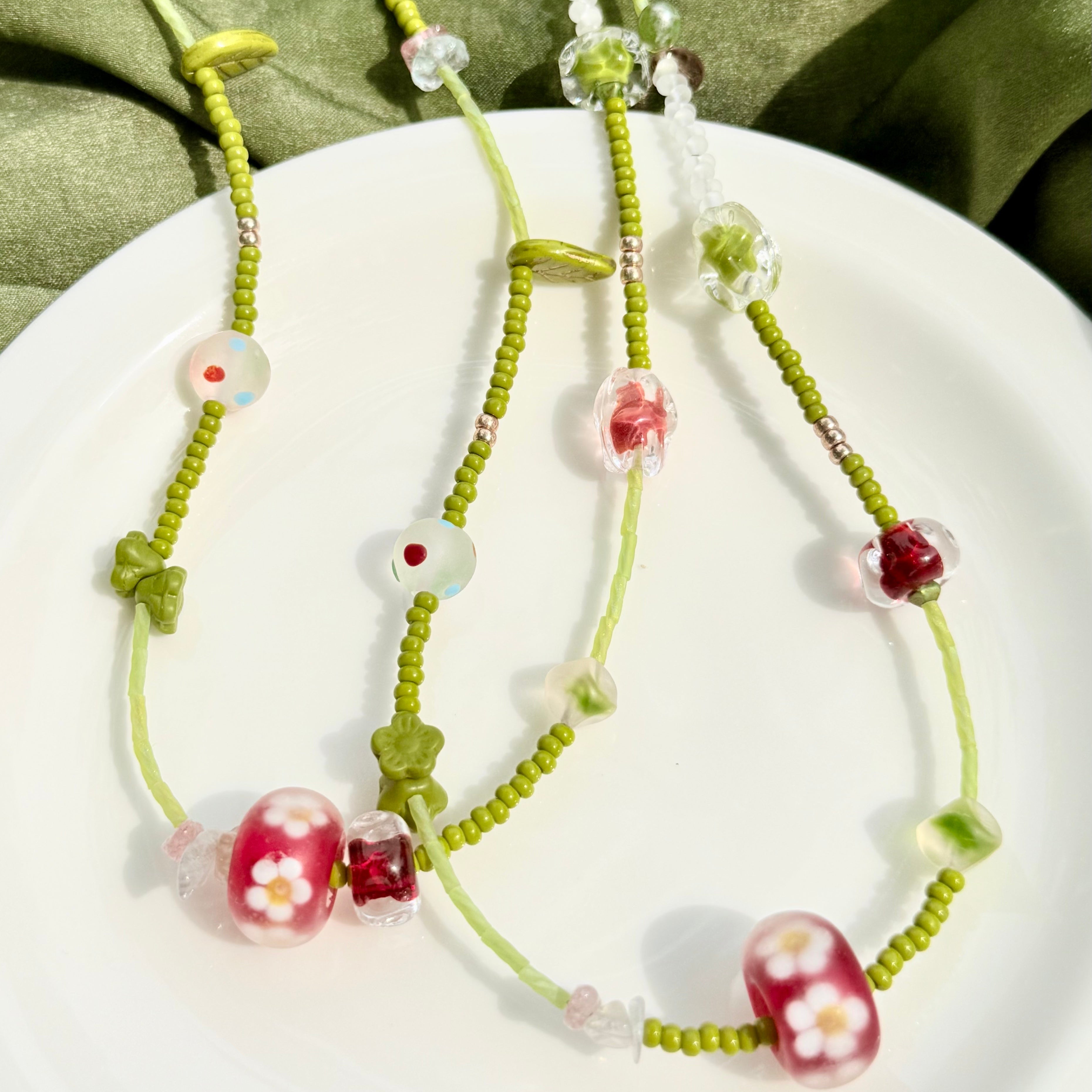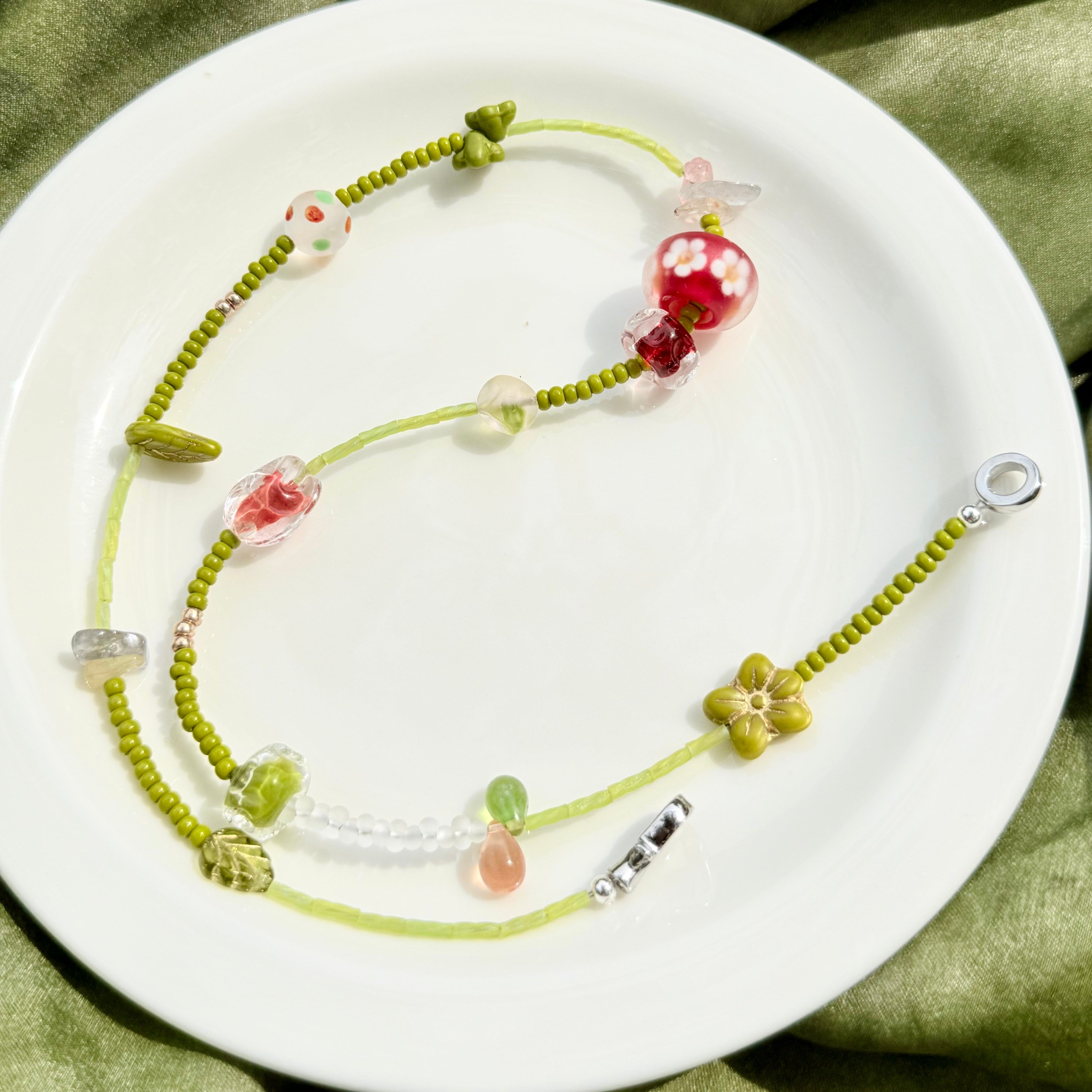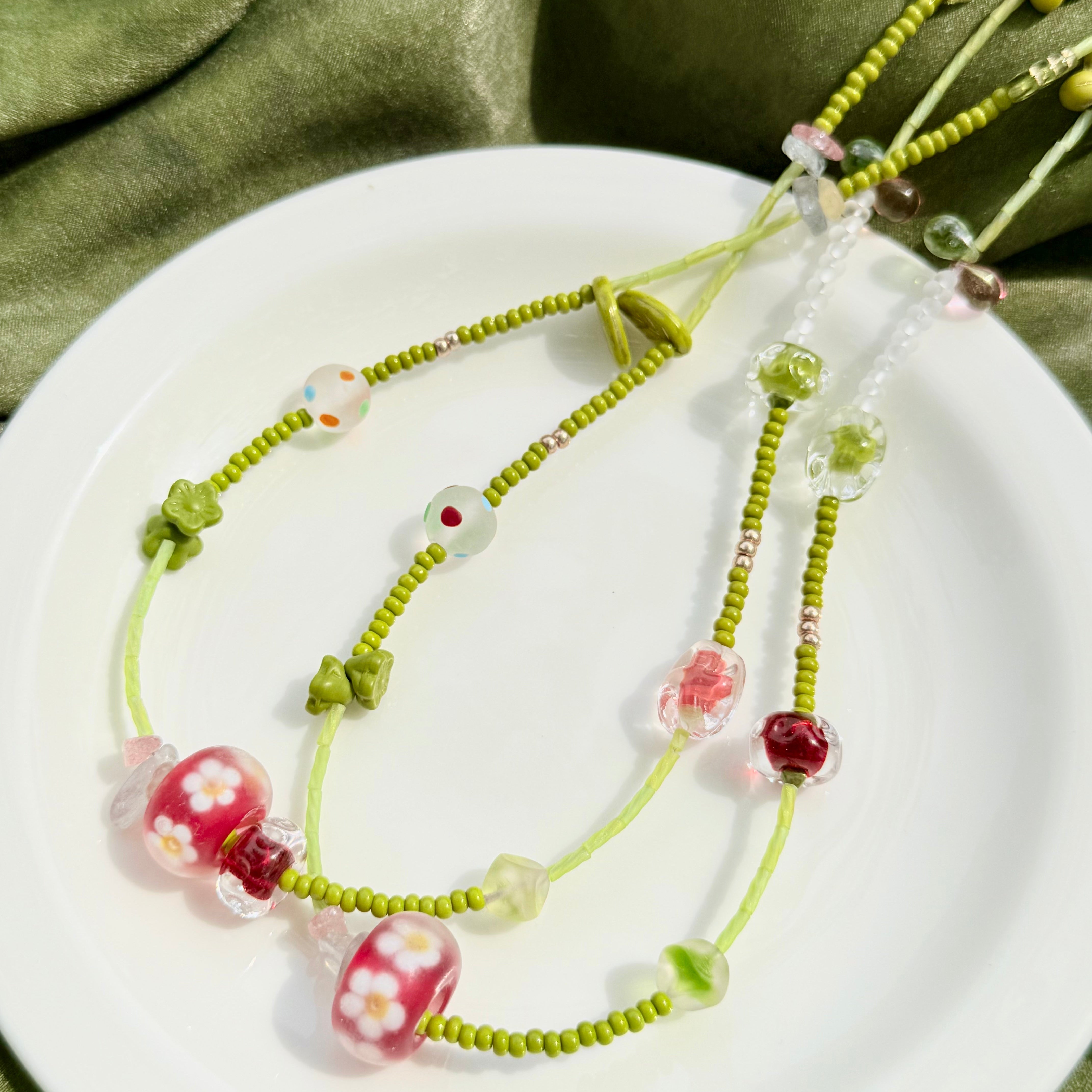 Forest Picnic is a handcrafted 50cm necklace inspired by the fresh, playful spirit of spring meadows. Featuring traditional lampwork glass beads from China, millefiori accents from West Asia, and delicate Japanese Miyuki tube beads, this piece blends soft greens and cherry reds in a joyful, nature-infused palette. Perfect for forestcore aesthetics, sunny outings, or a thoughtful gift for nature lovers.