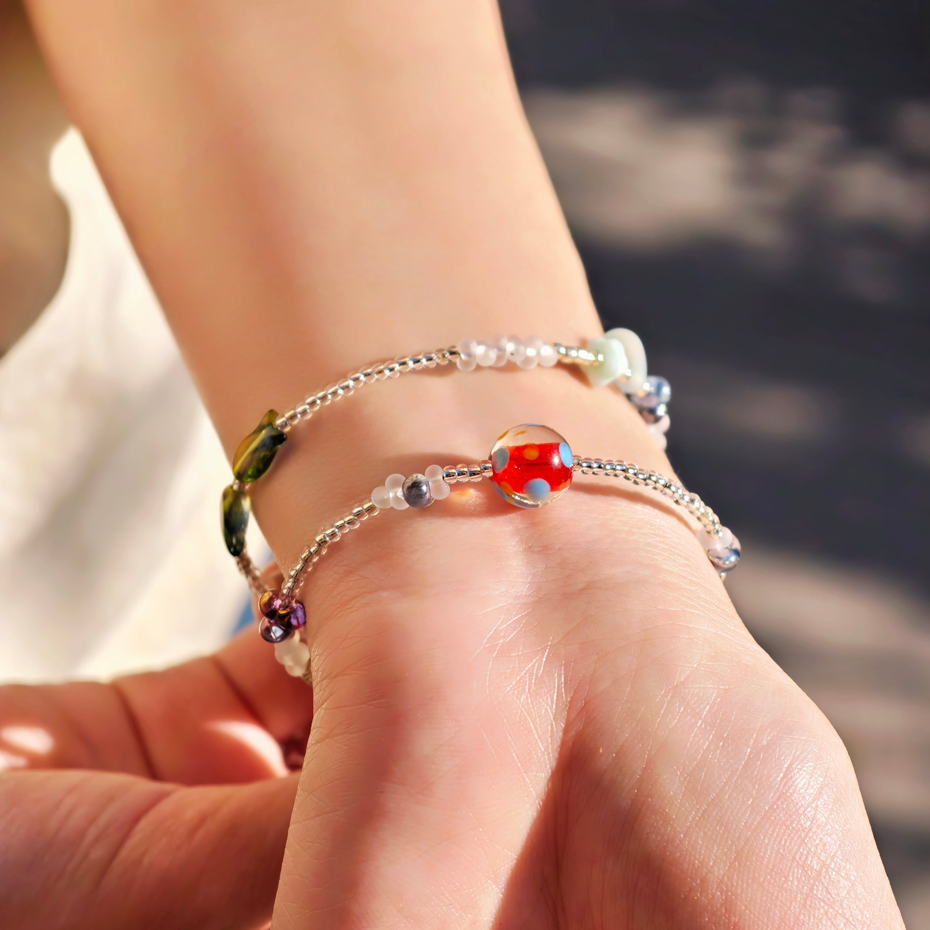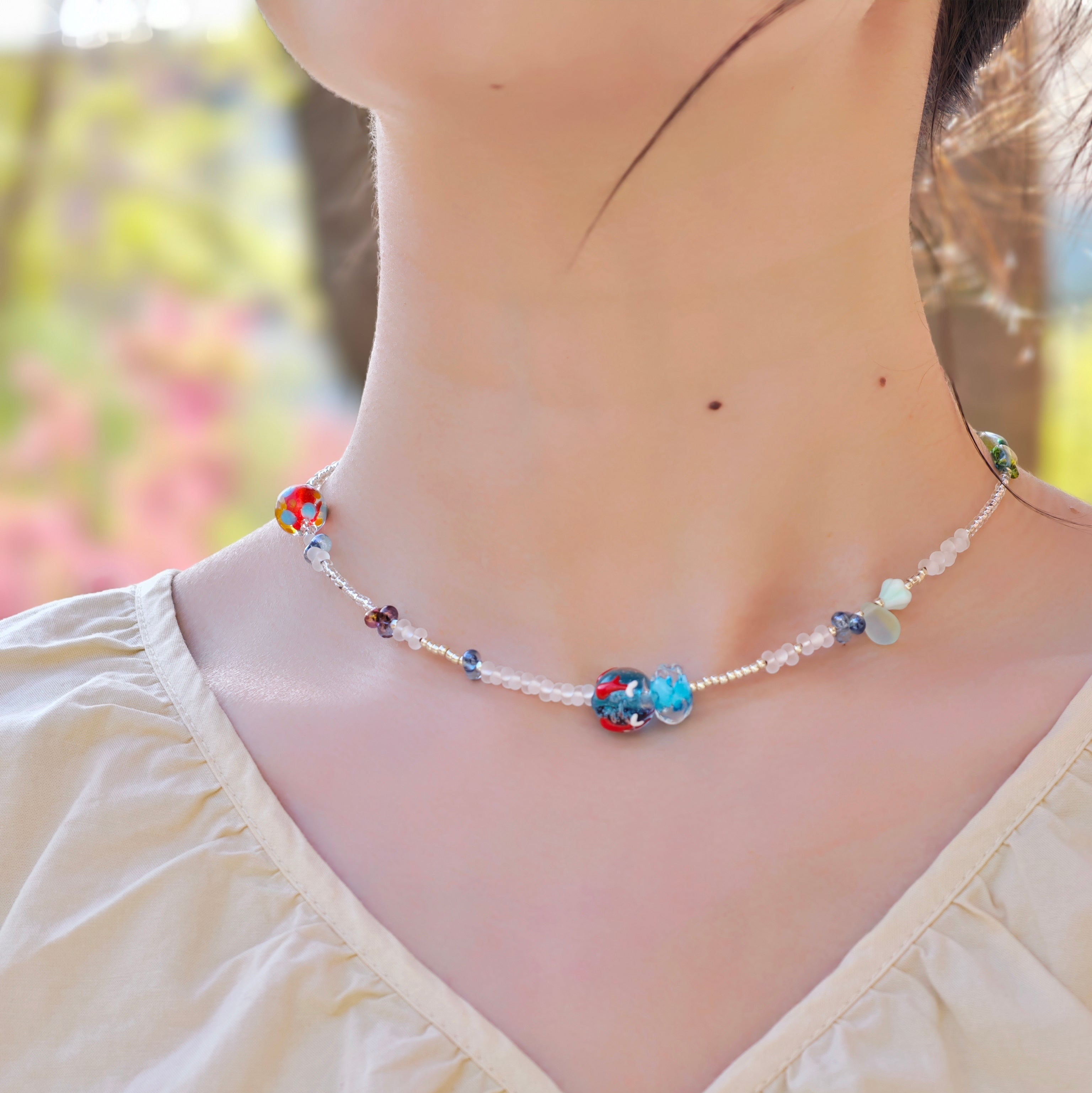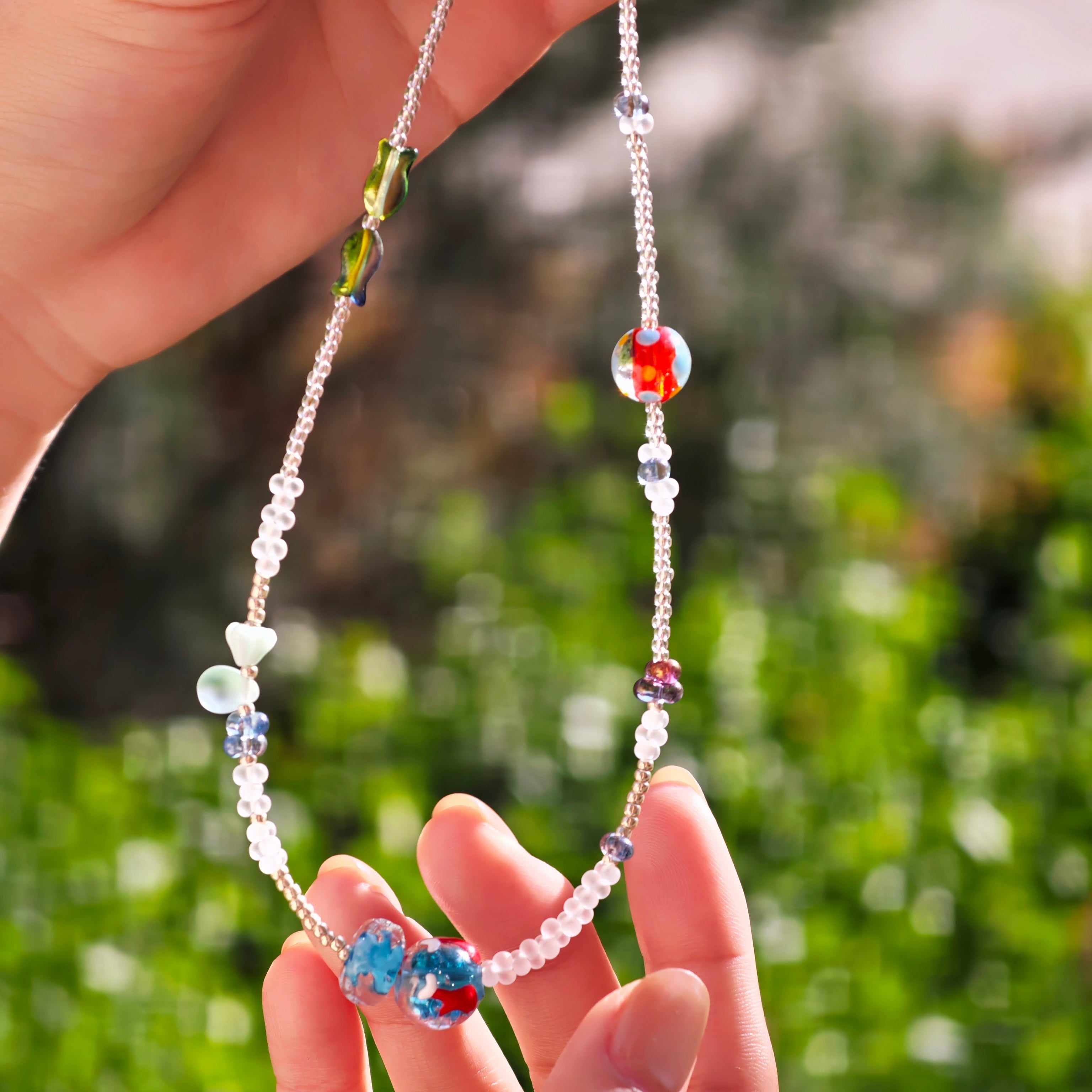 This handmade necklace features a unique lampwork glass bead, where a red goldfish swims within a dreamy bubble of translucent blue — like a drop of water frozen in time. Paired with delicate frosted and metallic seed beads, it's a piece that looks quiet indoors but shines brilliantly under sunlight.