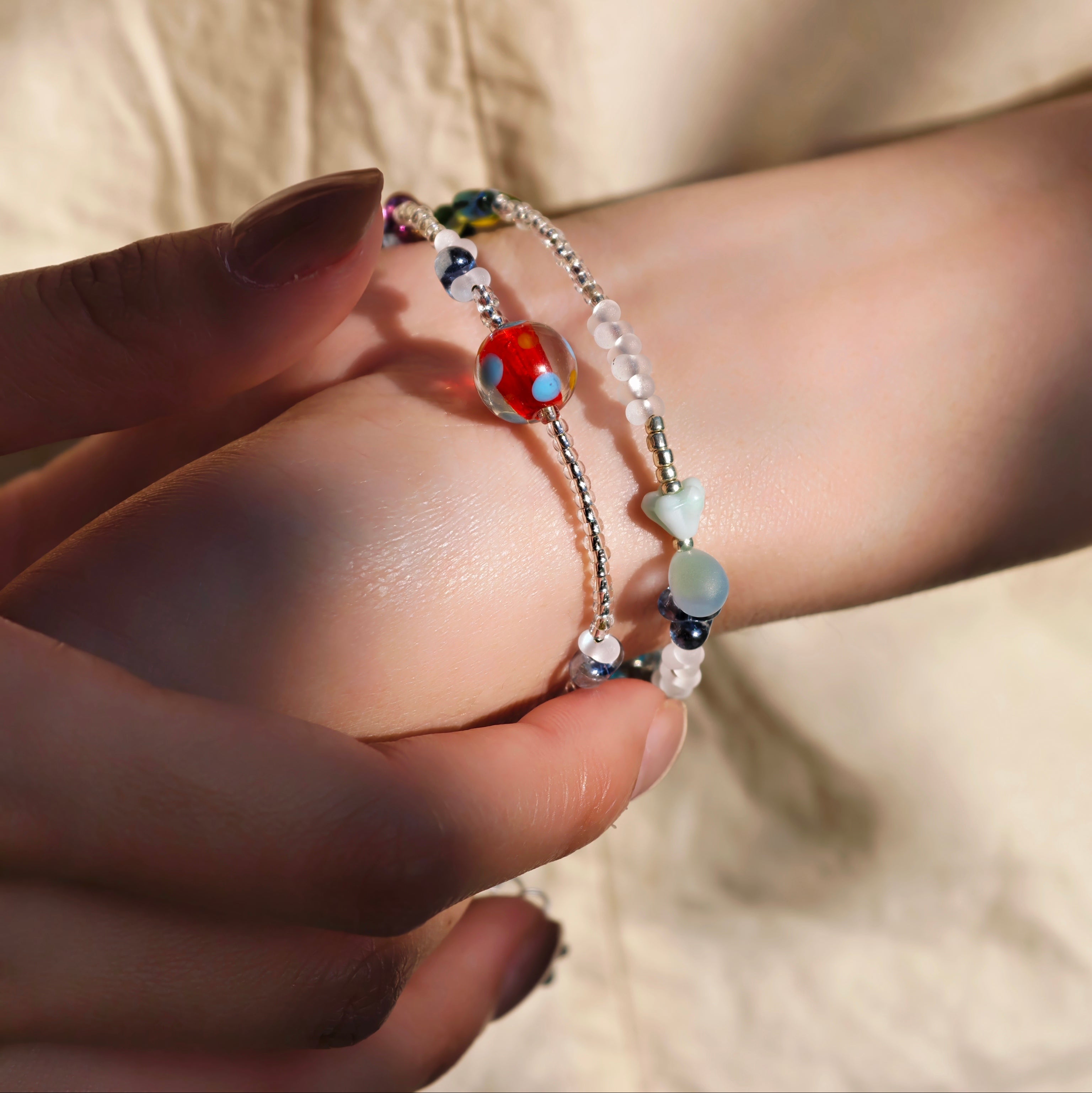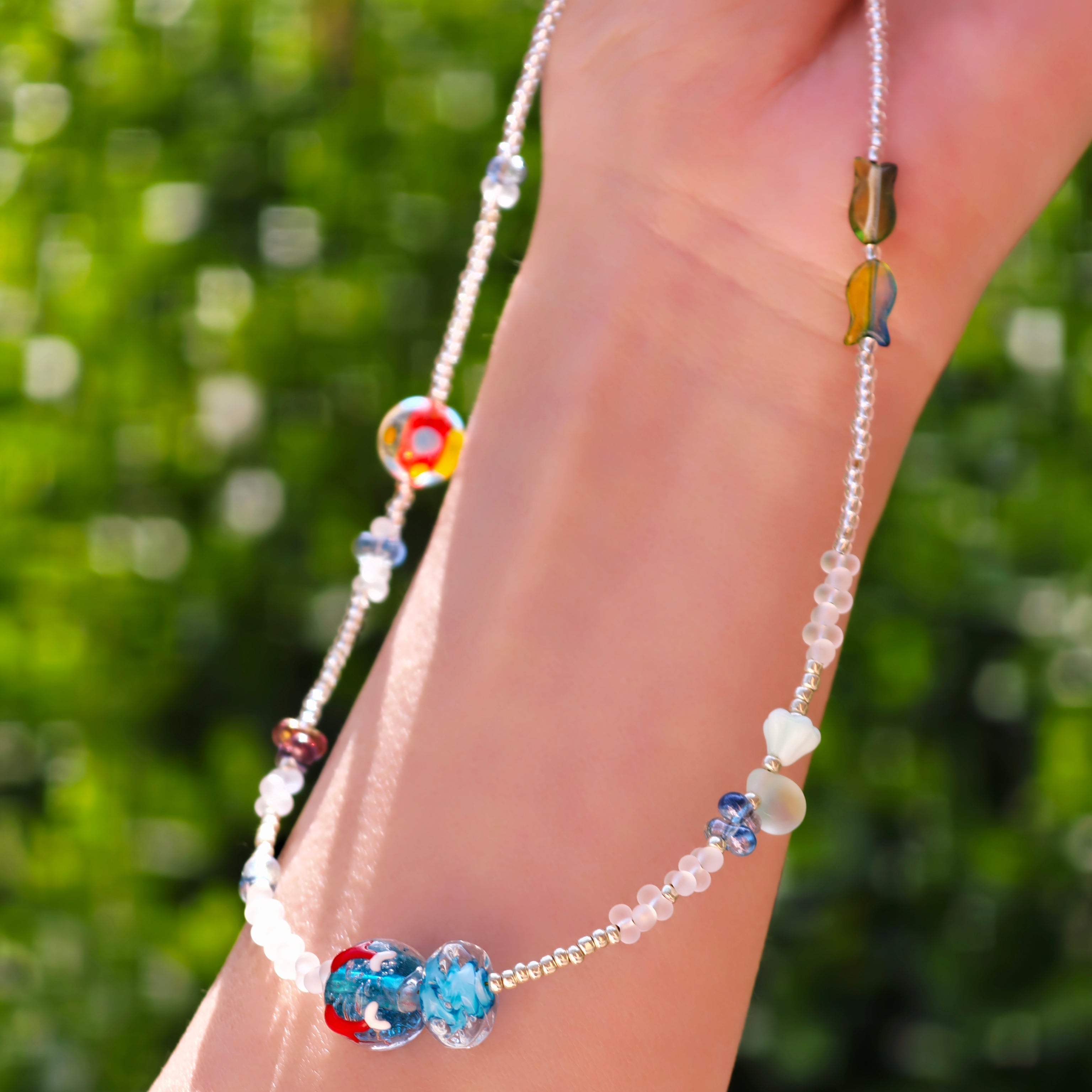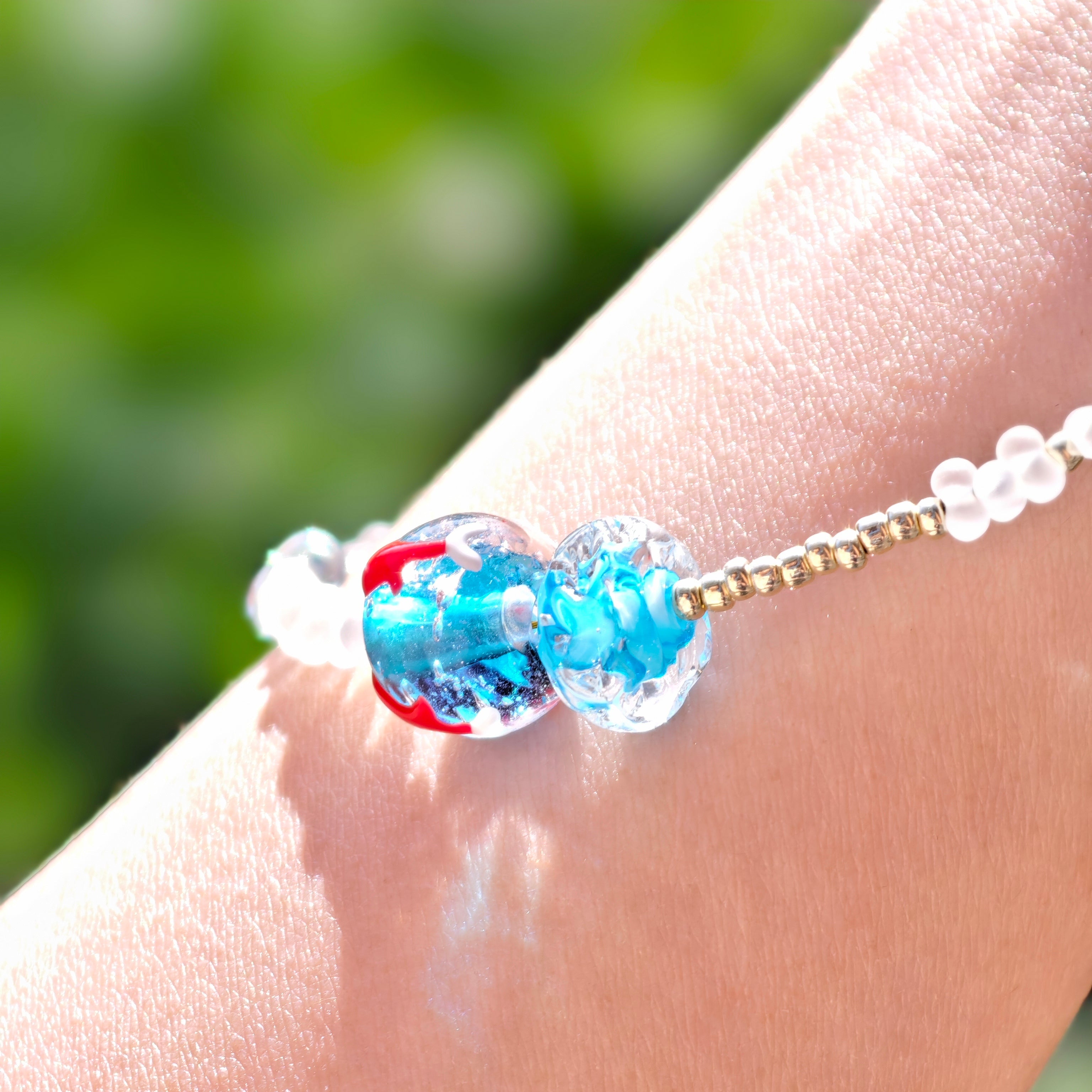 This handmade necklace features a unique lampwork glass bead, where a red goldfish swims within a dreamy bubble of translucent blue — like a drop of water frozen in time. Paired with delicate frosted and metallic seed beads, it's a piece that looks quiet indoors but shines brilliantly under sunlight.