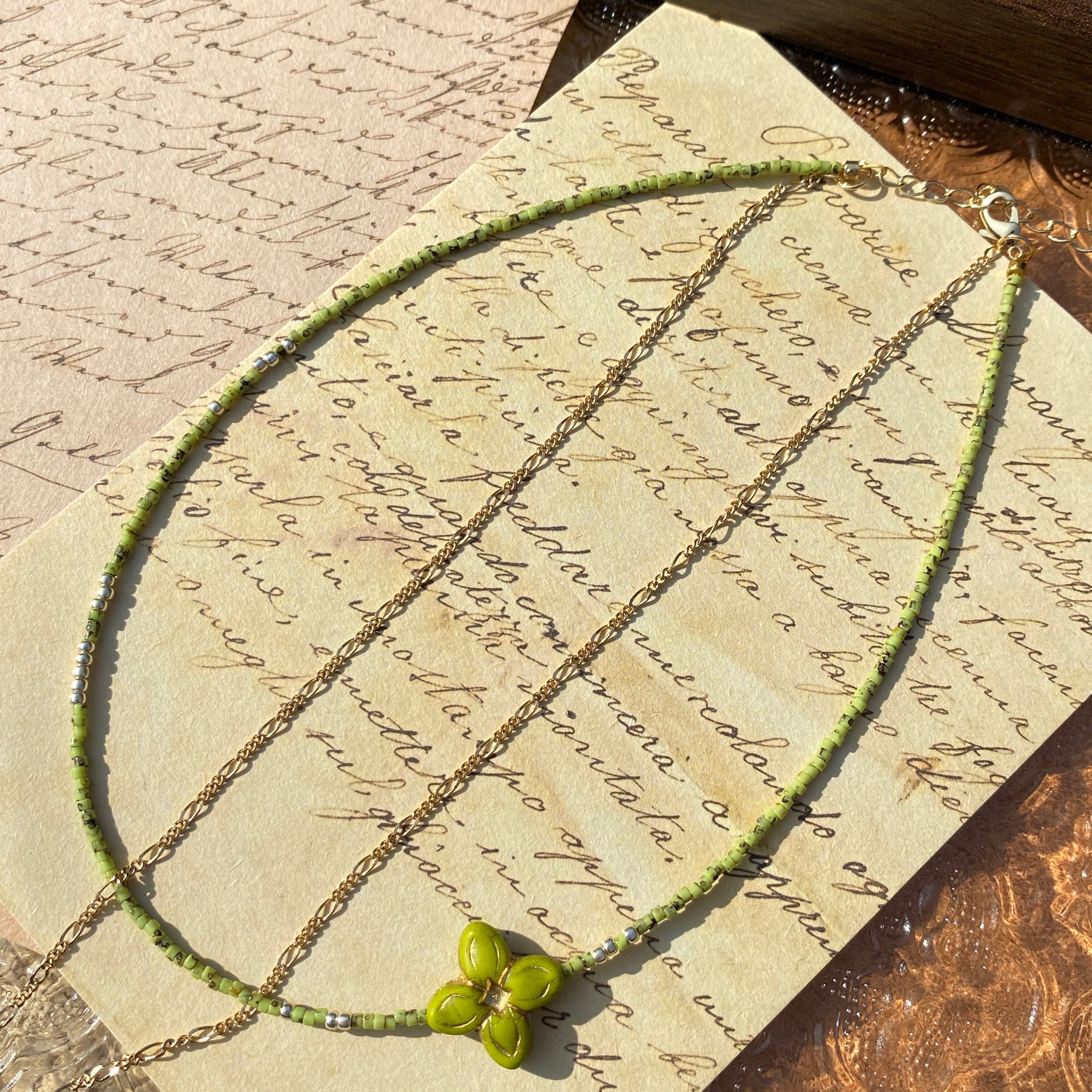 A delicate harmony of green Czech glass beads and a soft golden chain — Spring Glint is inspired by the quiet charm of early blossoms. The handcrafted four-petal flower centerpiece glows softly in sunlight, perfect for layering or wearing on its own.