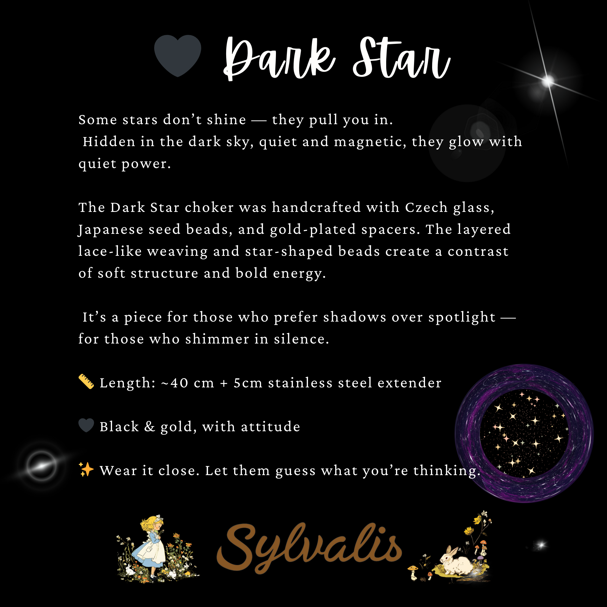 Dark Star 颈链采用捷克玻璃、日本种子珠和镀金隔珠手工打造而成。层叠的蕾丝编织和星形珠子,营造出柔和结构与大胆能量的对比。