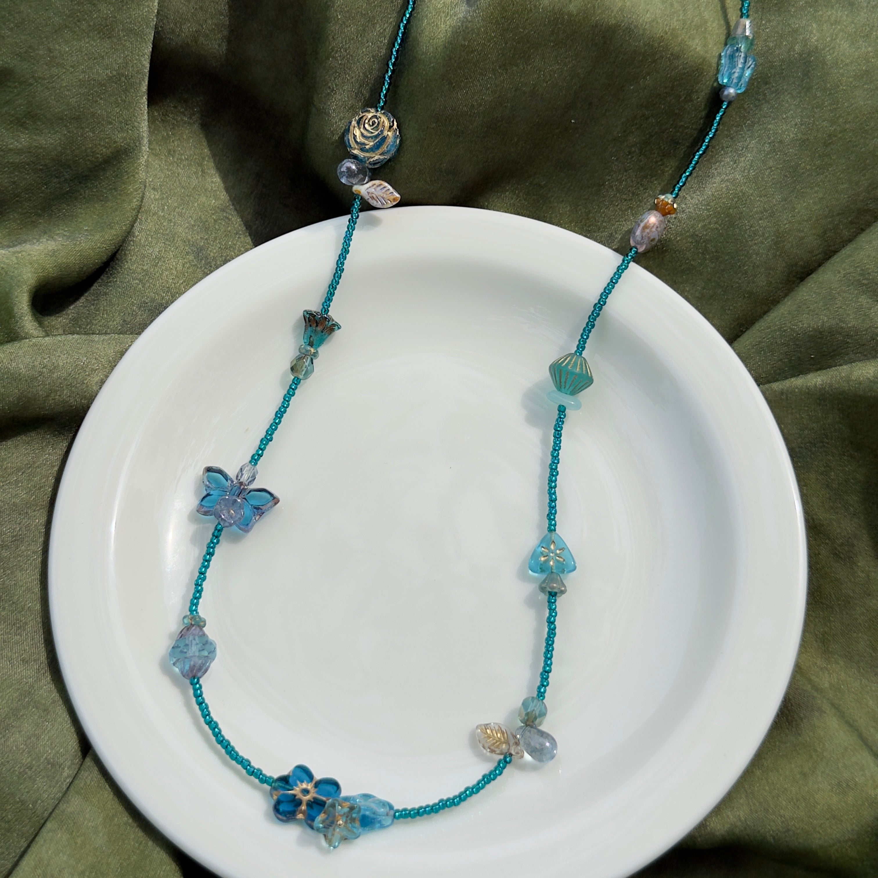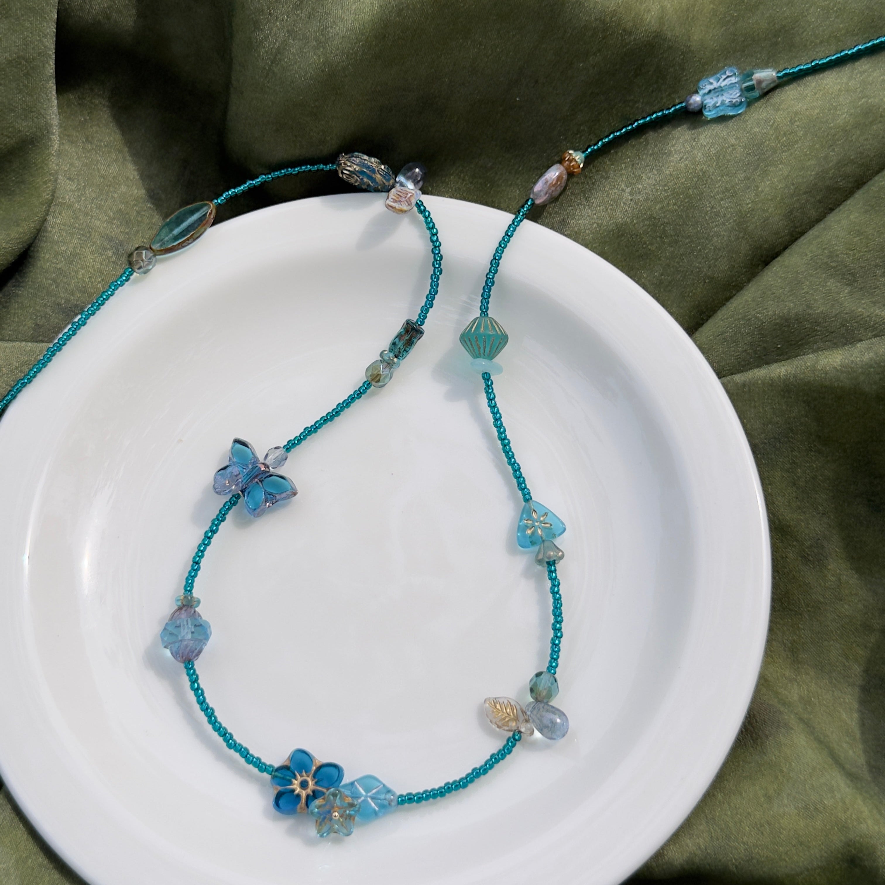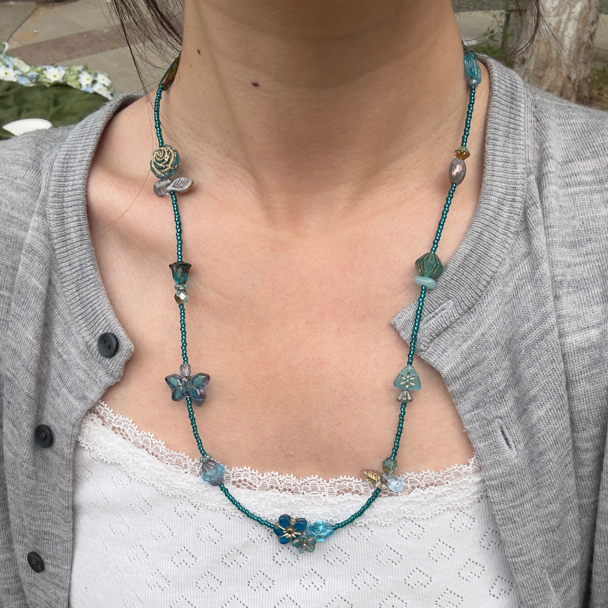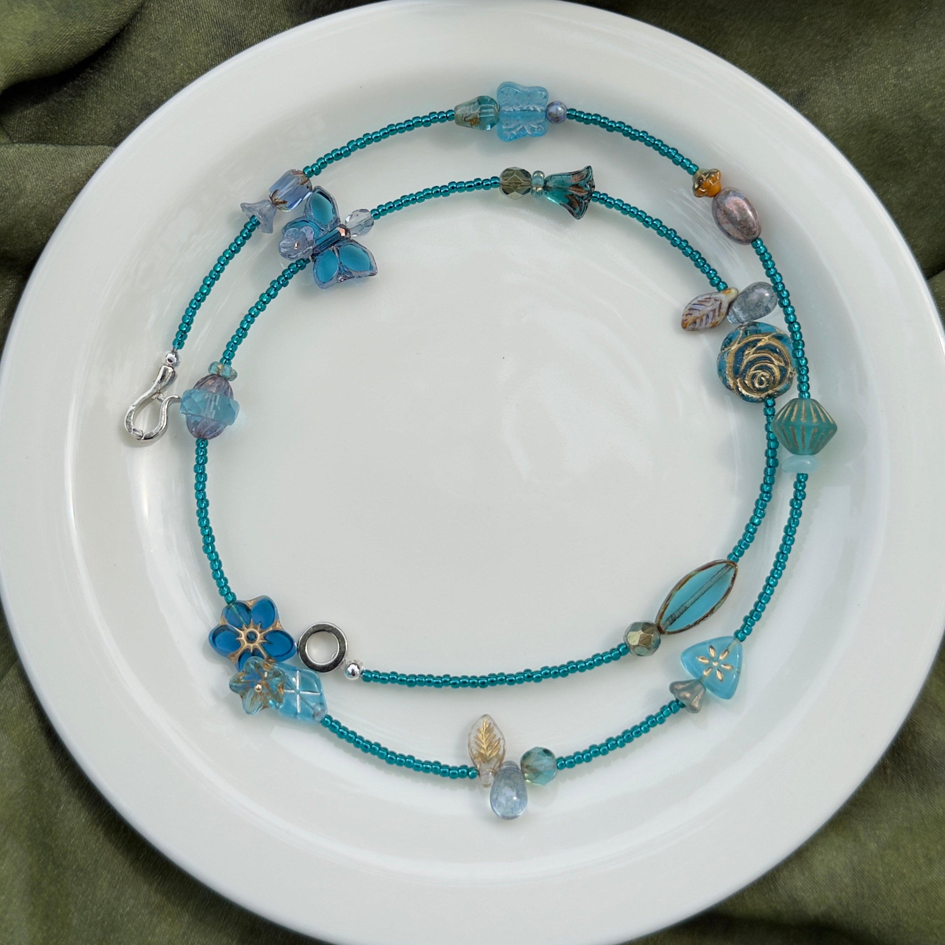A gentle tide of turquoise and sea-glass blue beads flows around your neckline in the Ocean Whispers necklace. Featuring butterfly and flower motifs, each Czech and antique glass bead is carefully selected to evoke the serenity of coastal mornings. Finished with fine Miyuki seed beads for a subtle sparkle.