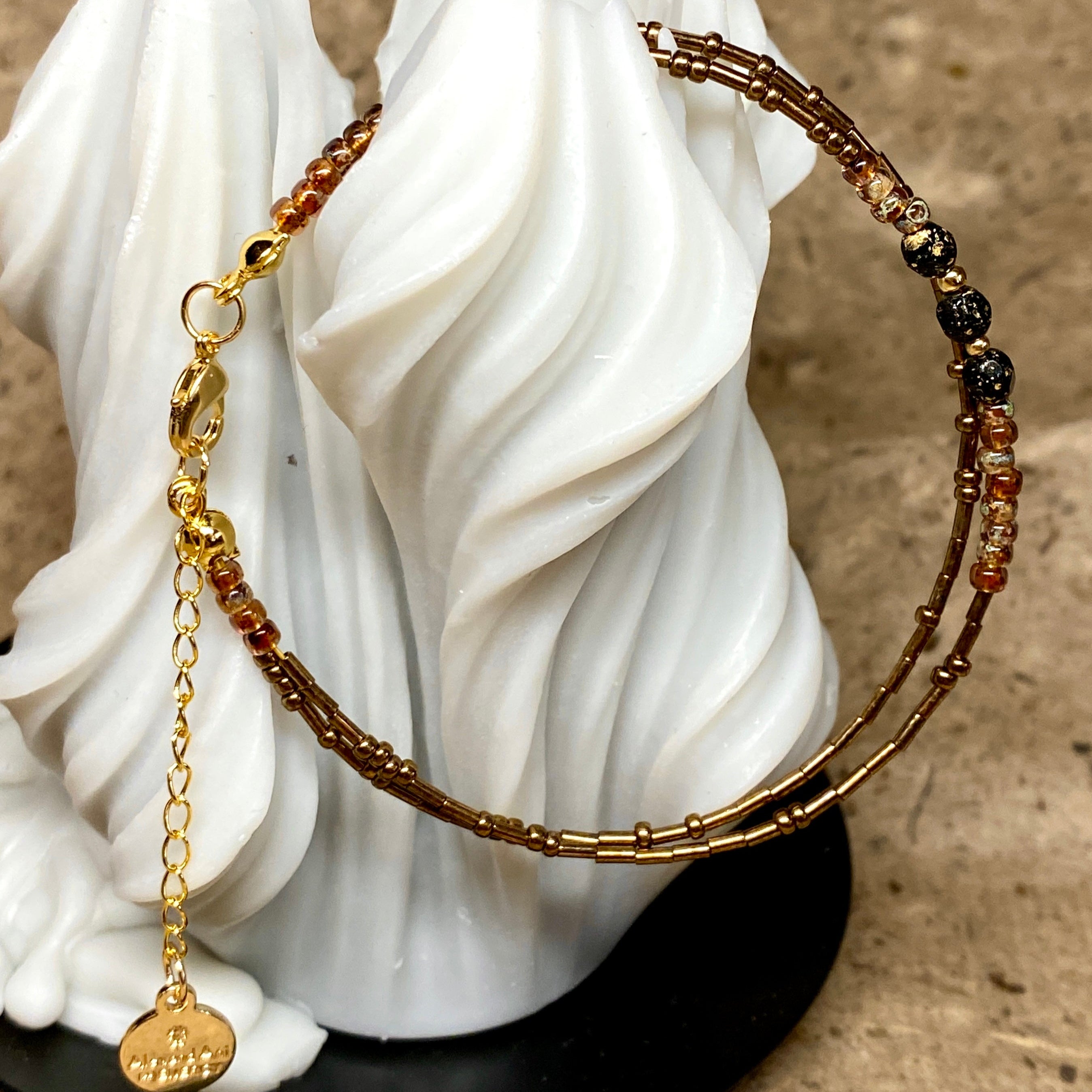 The Shadow Ember bracelet encodes your chosen phrase using Morse code, hand-strung with Japanese MIYUKI seed beads in smoky bronze, warm amber, and black with gold foil detail. The result is a subtle, meaningful piece with a message only you (and maybe one other) can read.