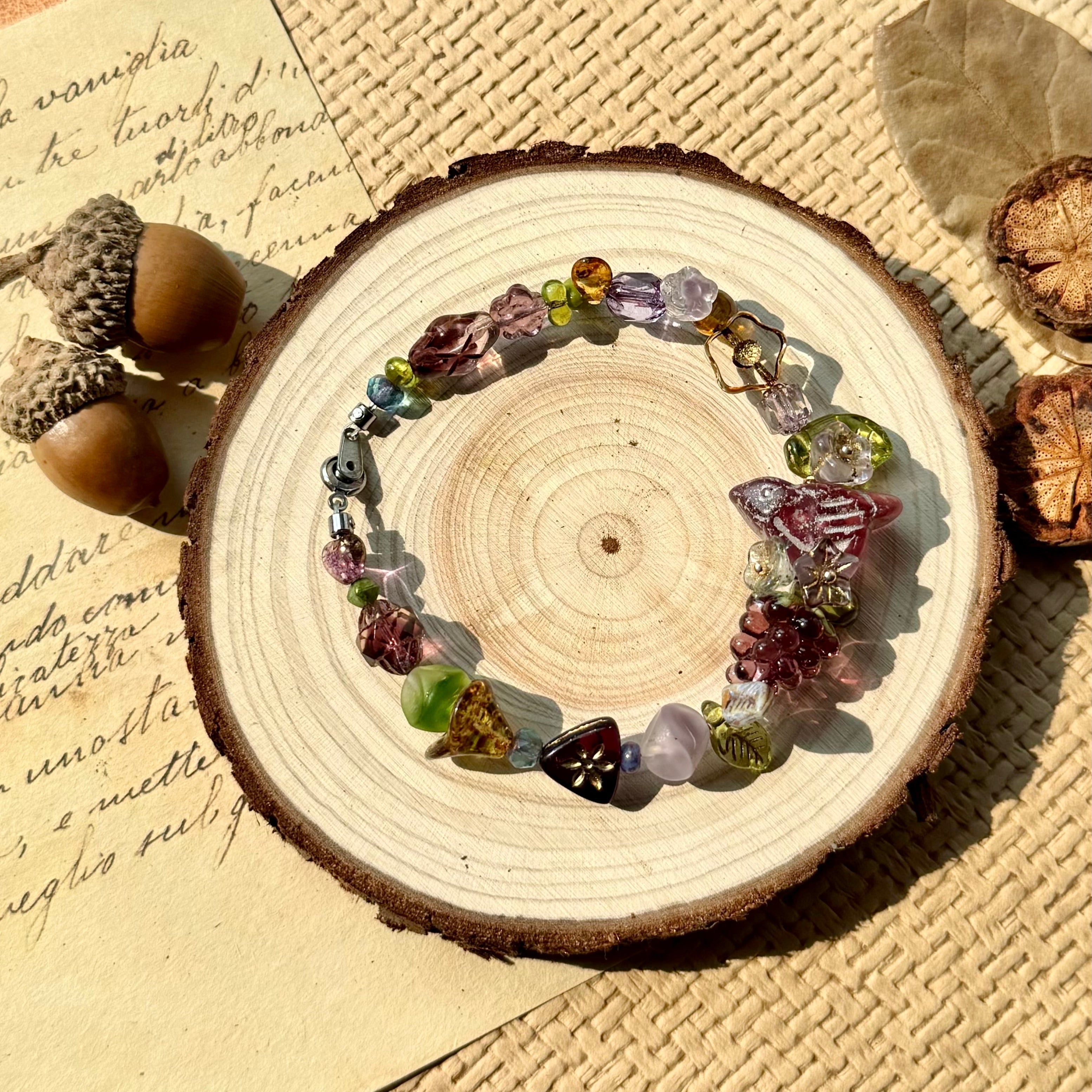 This 16cm bracelet is a celebration of ripeness and abundance — made from lush lampwork glass beads and finished with 14k gold-plated findings. Glass grapes dangle like ripe fruit, mingling with playful blossoms and citrus-bright accents in yellow, green, and lilac.