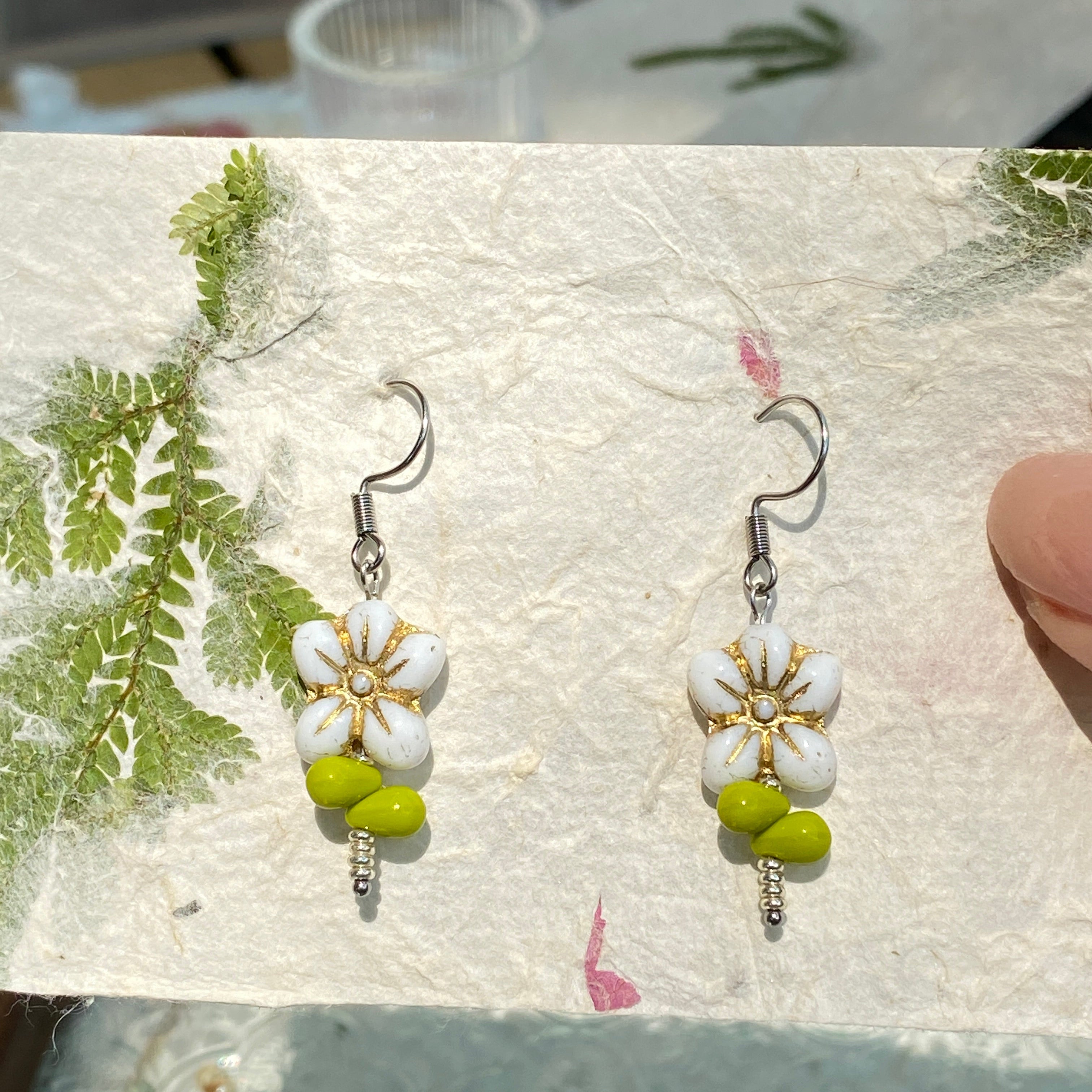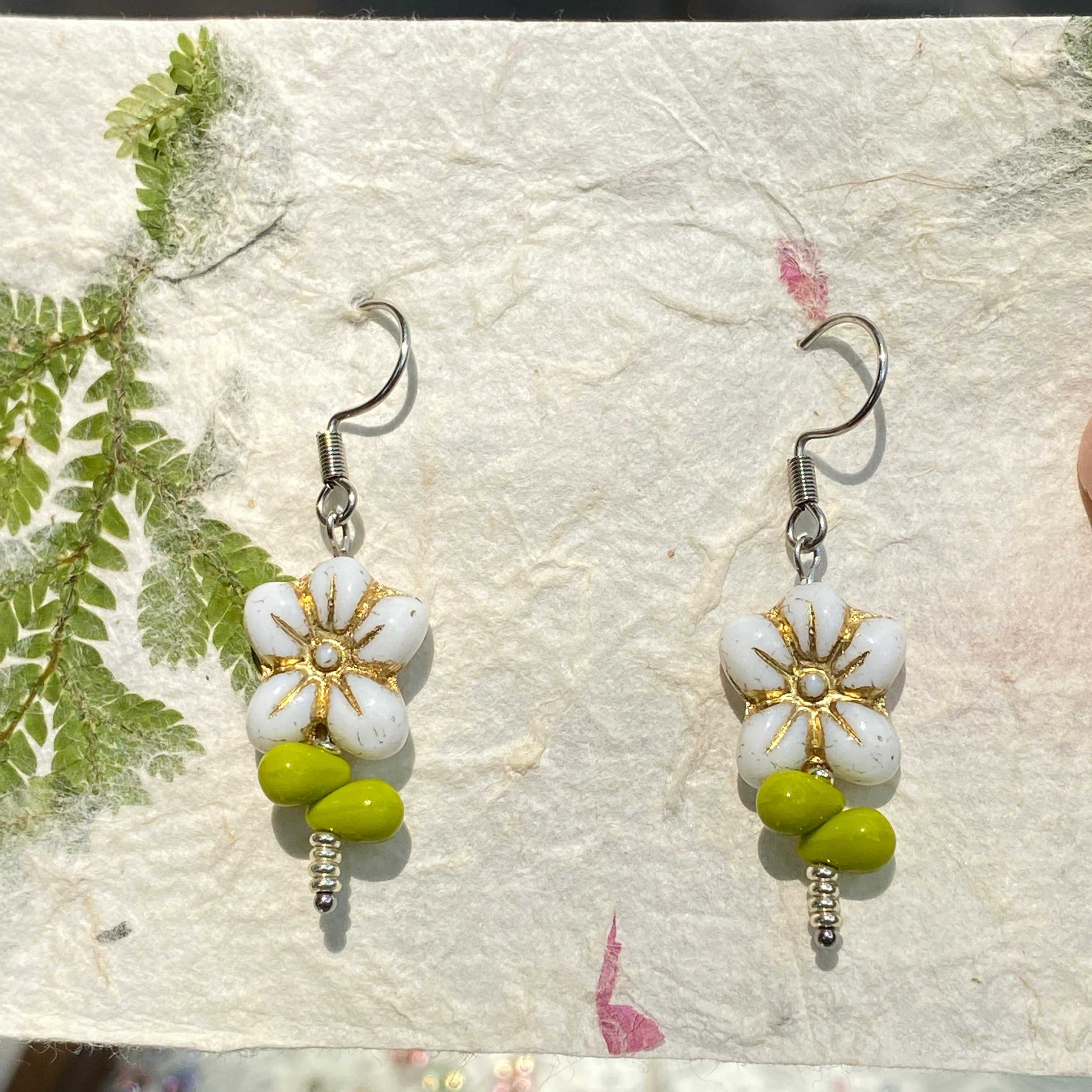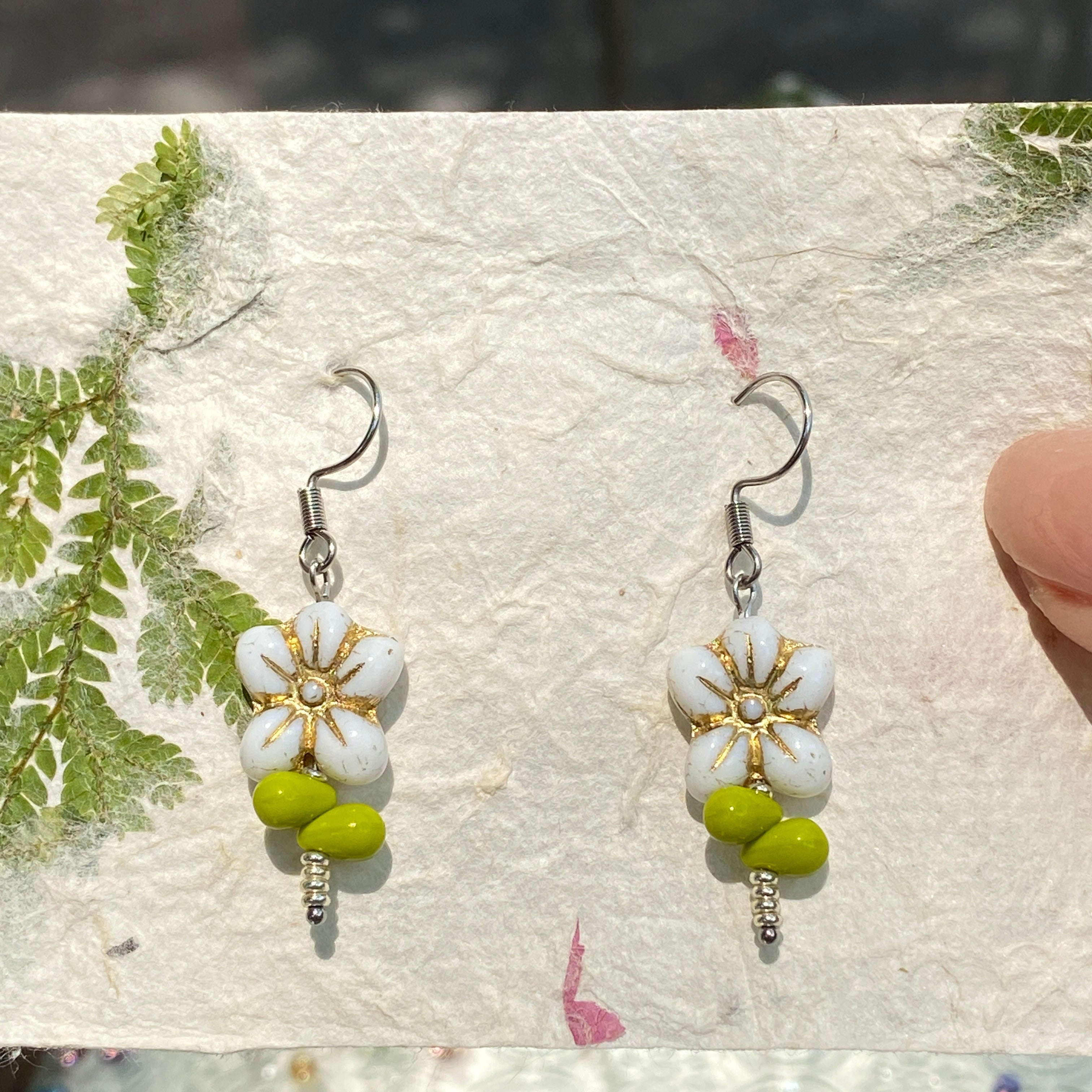 White Czech glass petals lined with gold, paired with dew-green beads and silver accents.
