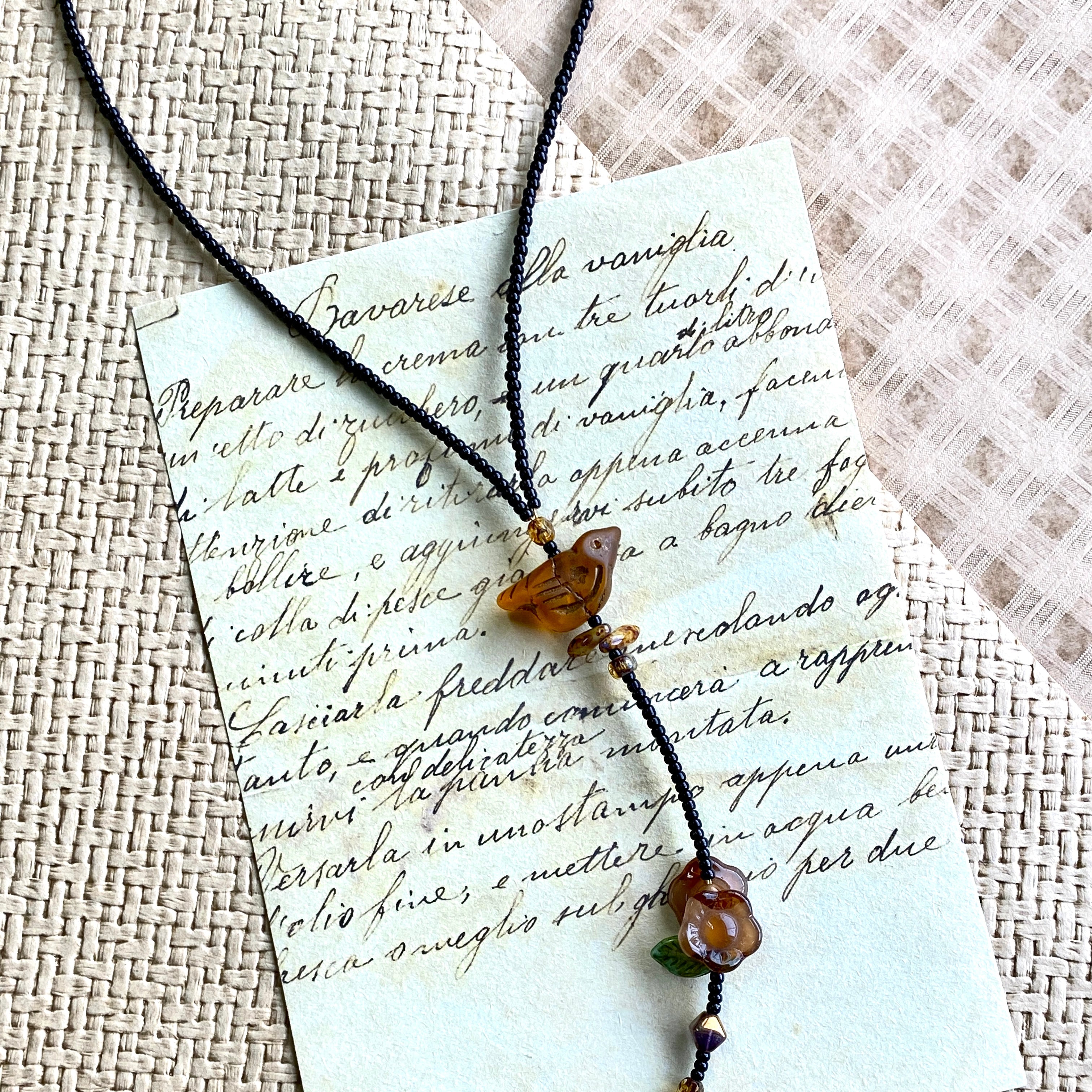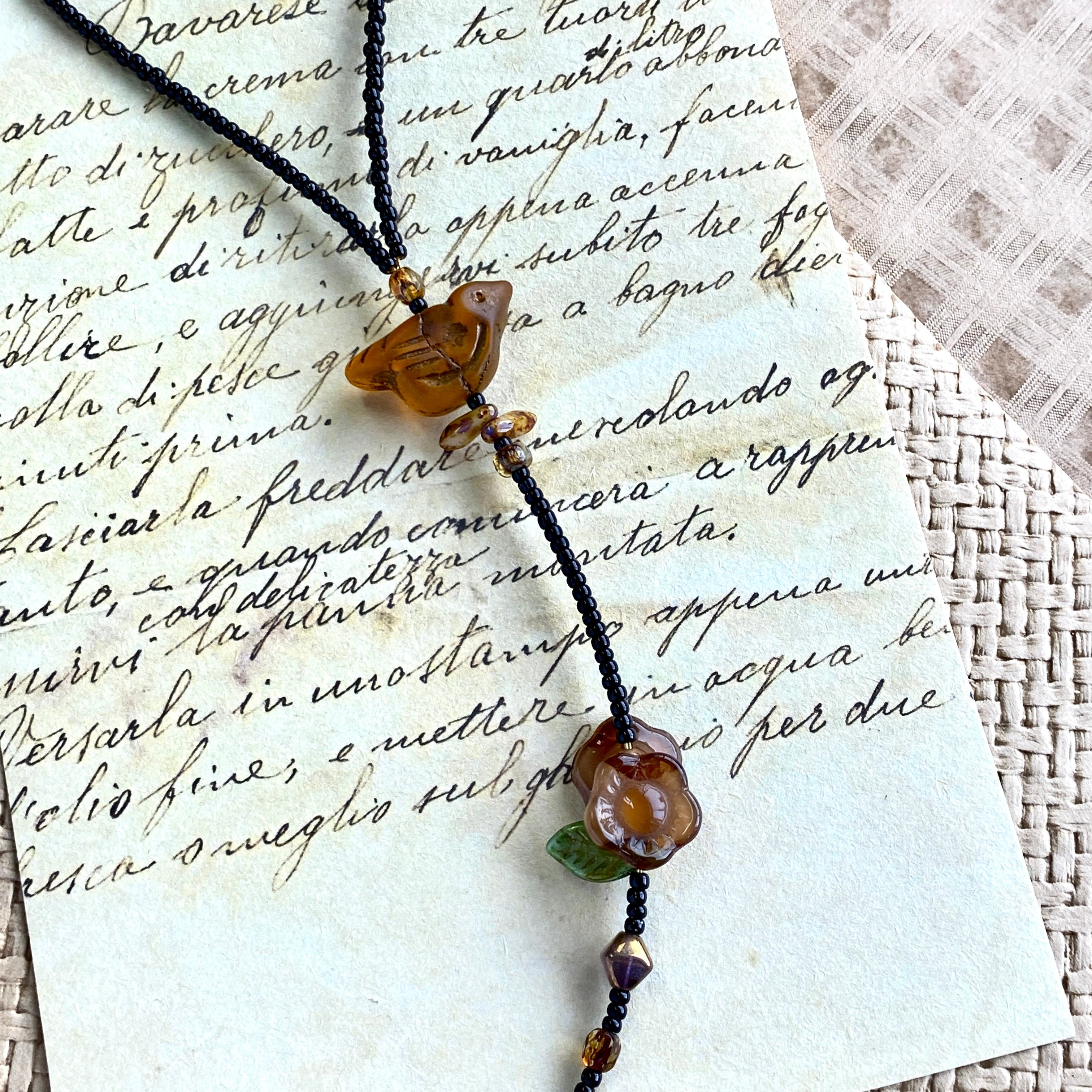 📿 Materials: Czech glass, pressed-glass bird and flower, glass seed beads