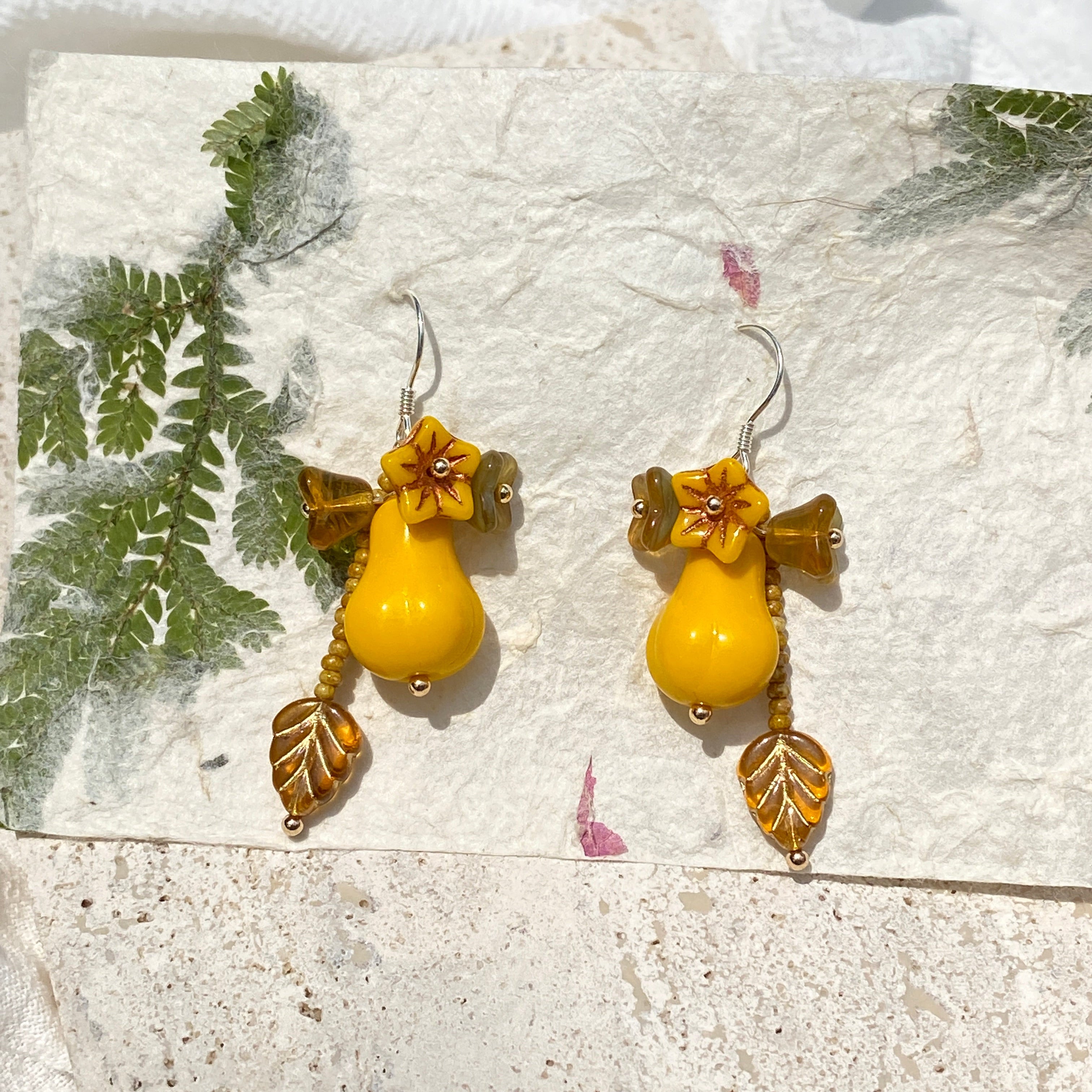 Handcrafted with Czech glass and 925 sterling silver, each earring features a bright yellow pear, tiny amber leaves, and a hint of floral green — like a little orchard, swaying beside your cheek.
