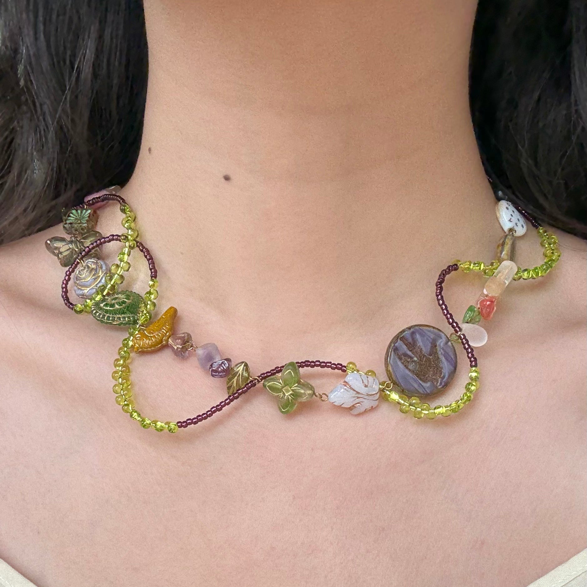 Inspired by the quiet mystery of dusk, the Twilight Vine necklace combines elegance with a touch of enchantment. Its winding, vine-like design captures the beauty of nature, while the shimmering beads reflect the soft glow of twilight.