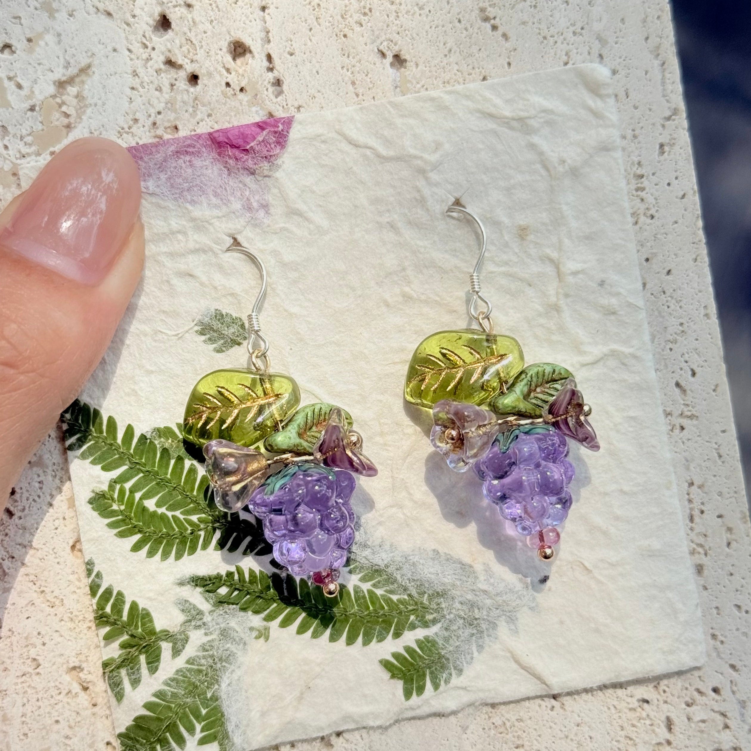 Crafted with pressed Czech glass beads, including translucent grape clusters, green leaf details, and delicate floral bell accents, this piece feels like something you’d find in a Stardew Valley greenhouse or under a forest canopy at dusk.